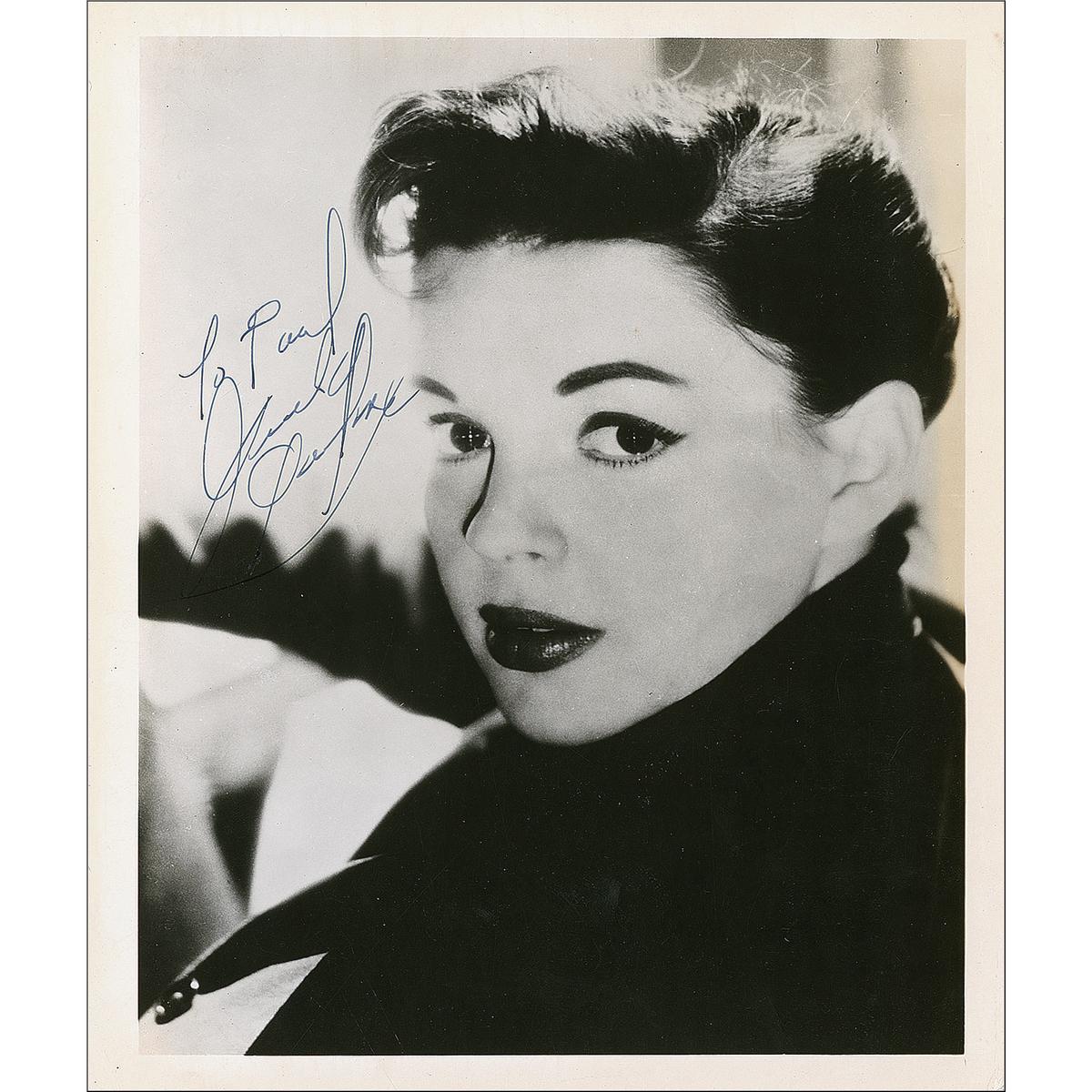 Vintage glossy 8 x 10 photo of Garland looking over her shoulder, signed and inscribed in blue ink “To Paul, Judy Garland.” In fine condition, with scattered light creases and surface marks, none affecting the bold signature.