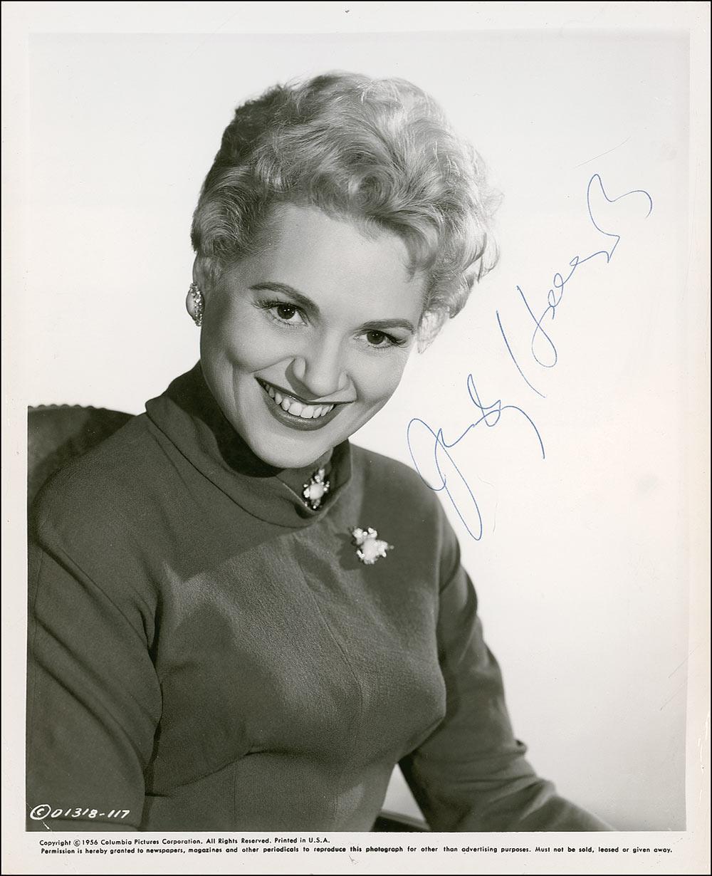 Academy Award winner for her performance in Born Yesterday, who died of cancer at the age of 43. Vintage glossy 8 x 10 Columbia Pictures 1956 publicity photo, signed in blue ballpoint. Collector’s notation on reverse indicates signature was acquired on March 26, 1959, backstage at the National. In very good condition, with scattered creases and surface marks, primarily to borders and corners, a few surface impressions, and light horizontal streaking to emulsion.