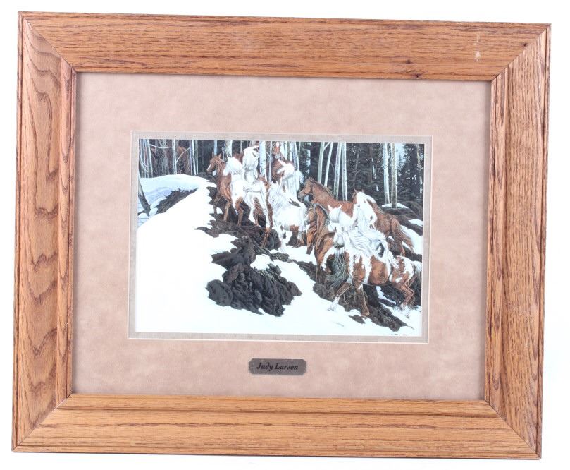 Included in this lot we have a Judy Larson framed print titled "Phantom Patrol". Judy Larson is a American artist known for her depictions of wildlife primarily wolves and horses. This print displays a herd of wild pinto horses as they move over a rocky, snow covered forest. The paint patterns on the horses creates the image of three braves on horse back. The piece shows wonderful realistic art style and excellent attention to detail. The print is set into a wood frame with a tan or light brown border around the art. The piece shows a brass plaque reading "Judy Larson. The print shows good condition overall with some light wear across the frame. The frame measures 22 1/2" wide by 18 1/2" tall with the art measuring 12" wide by 8" tall.