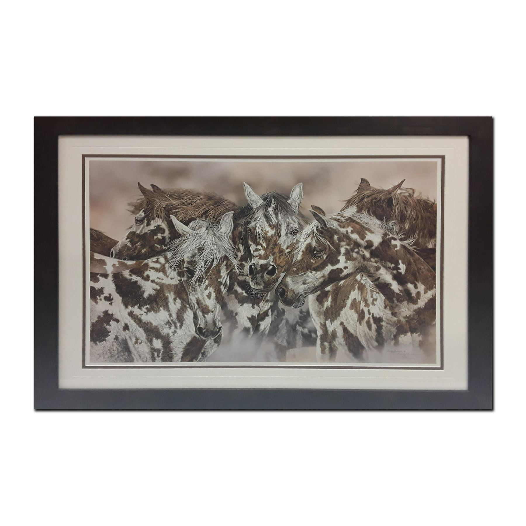 Judy Larson's "The Packherd" limited edition print signed and numbered 2688/2950. This has been custom framed and matted with acid free matting. This print is of five brown and white horses. This is perfect for the equestrian lover. Image- 20" x 28 1/2". Frame- 28 3/4" x 37 1/2"