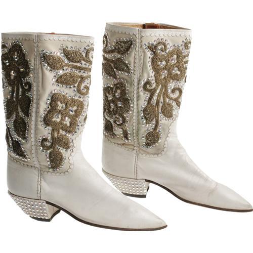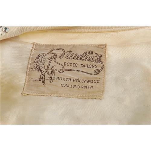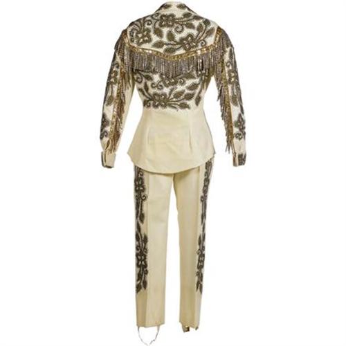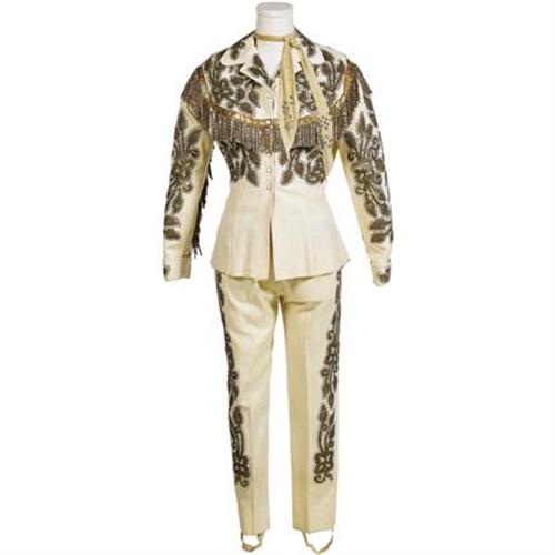 <B>Judy Lynn Stage Worn Suit by Nudie Cohn.</B></I> A cream colored pantsuit decorated elaborate gold designed, fringe, and rhinestones, complete with a pair of matching boots. Designed by Nudie Cohn, with his label sewn inside the jacket, and worn during a television performance by Lynn. Also included is a color postcard of Lynn in the suit. In Very Fine to Excellent condition with a little wear along the bottom edge of the jacket.<I>From the Robert Johnson Memorabilia Collection.</B></I><BR><BR><b>Shipping:</b> Clothing, Costumes & Jerseys (<a target="_blank" href="http://www.heritageauctions.com/common/shipping.php">view shipping information</a>)