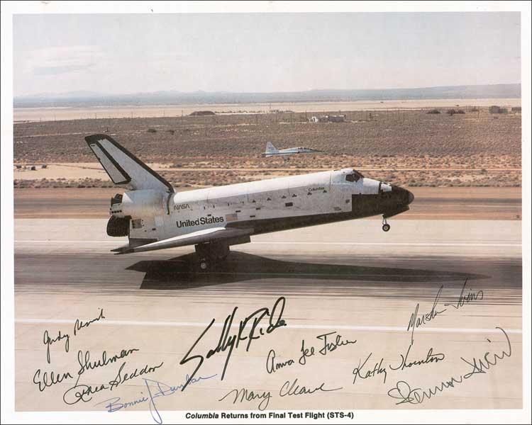 Color 10 x 8 NASA photo of the space shuttle Columbia returning from its final test flight, signed in ink and felt tip by the first ten United States female astronauts including Judy Resnik, Sally Ride, Bonnie Dunbar, Ellen Shulman, Rhea Seddon, and Kathy Thornton. In fine condition, with three binder dings to top edge. Pre-certified Scott Cornish and RRAuction COA.