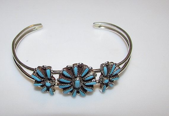 For your consideration is this wonderful smaller vintage Native American Zuni sterling silver Sleeping Beauty turquoise cluster rosette cuff bracelet in wonderful vintage condition by the highly collectible Zuni artist Judy Wallace. This fabulous piece features a traditional Zuni cluster rosette design in sterling silver accented with genuine sky blue turquoise cluster design. The cuff is marked 'Sterling" is signed by the artist, and marked "ZUNI". Measures about 3/4" wide and the inside circumference is about 6" including gap. The gap is about 1 1/2" wide. The cuff can be carefully adjusted. All stones are original and intact. Stunning example of vintage Native American art to add to any collection!