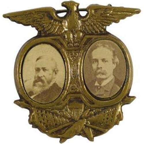 <B>Jugate Harrison & Reid Pin from the 1892 Presidential Campaign.</B></I> A 28mm stamped brass frame dominated by an American eagle encases images of Benjamin Harrison and Whitelaw Reid. An attachment pin is soldered to the verso. Excellent condition overall with strong, deeply toned portraits. This memento from Harrison's unsuccessful race against Democrat Grover Cleveland is much scarcer than similar Republican pins from 1888 featuring Harrison and Morton.<BR><BR><b>Shipping:</b> Small Collectibles (<a target="_blank" href="http://www.heritageauctions.com/common/shipping.php">view shipping information</a>)