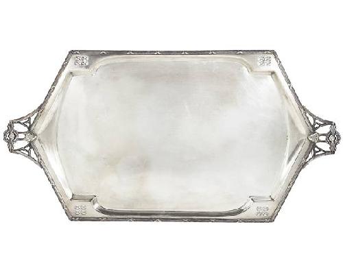 Silver-plated nickel-silver. Cast handles, pierced decoration on the corners. Marked: Argentor, circa 1900 Size: 80 x 41 cm