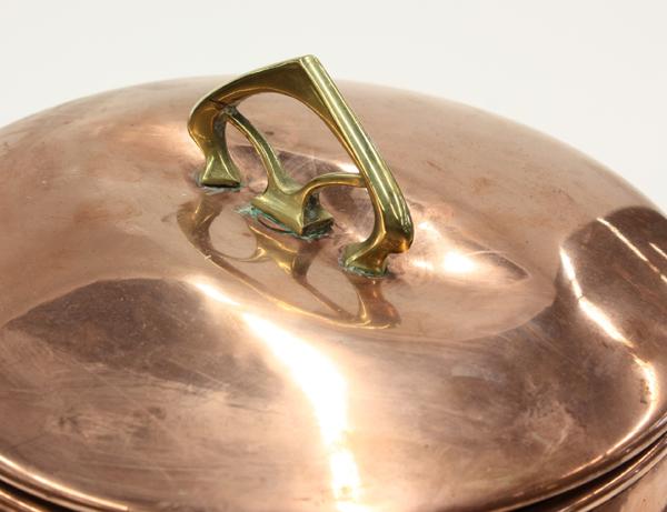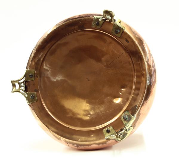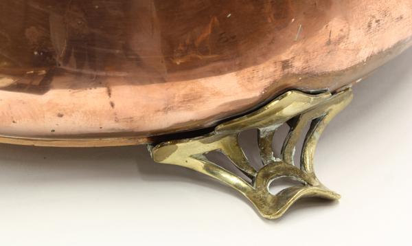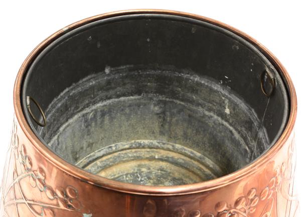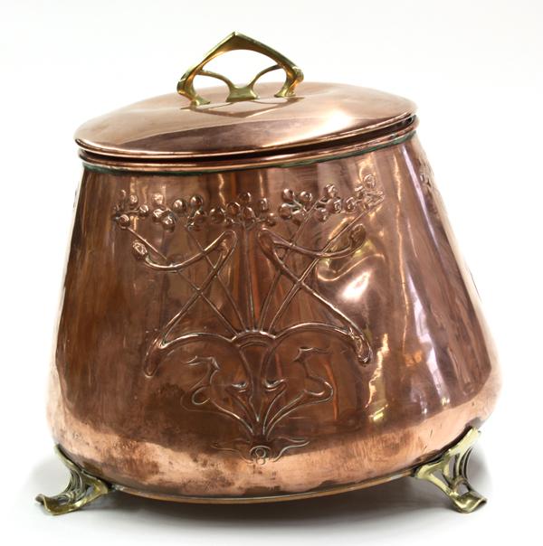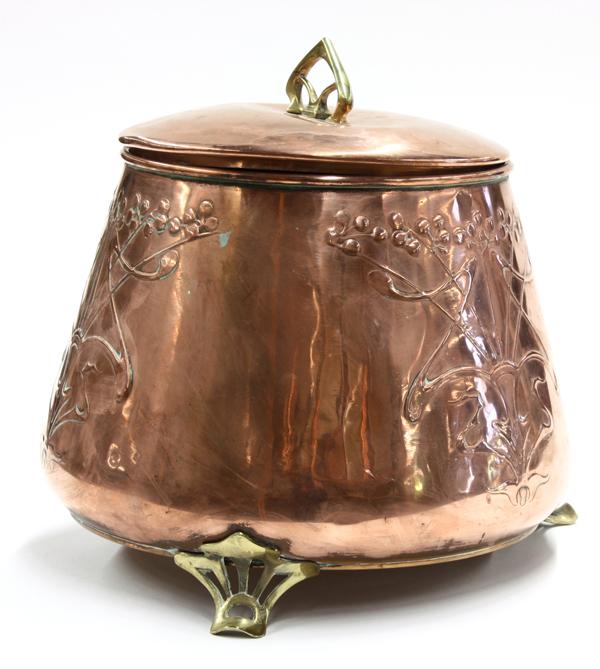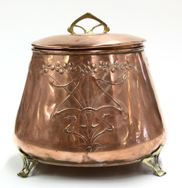 Jugenstil copper wine cooler circa 1900, the bulbous form having reposse medallions of stylized floral sprays executed in the Art Nouveau taste, and rising on brass reticulated outswept feet, 12''h x 11''w