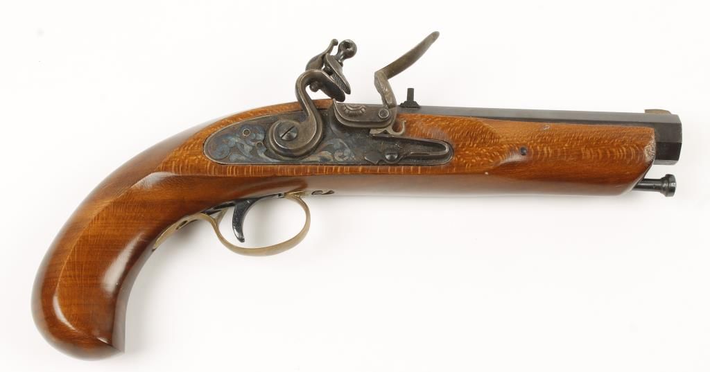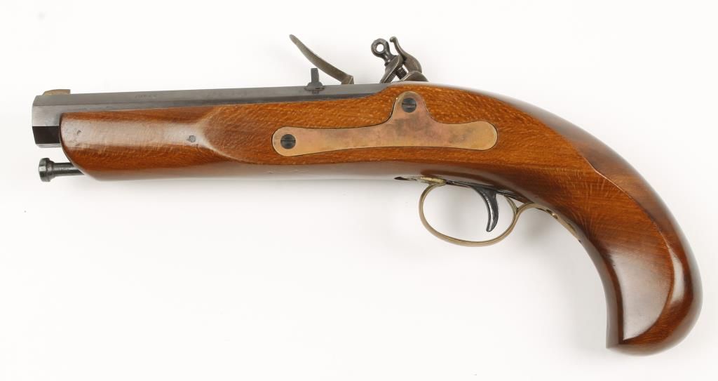 Spanish made flintlock reproduction pistol with 5" rifled octagon blued barrel. Hardwood stock, case colored lock, brass trim, and fixed sights. The flint is missing. Condition: Good showing small wear on right side near muzzle.