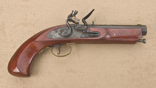 Jukar flintlock pistol made in Spain, styled after Kentucky pistol. Measures 12” overall, with 6” octagon barrel, approx. .45 caliber, good to very good used condition. Est: $50 - $100