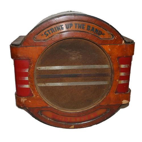 Jukebox Speaker - Strike Up the Band- by Wurlitzer - Unrestored condition. Box is solid with only a few minor veneer issues. Plastics are present and uncracked, but striping is faded.