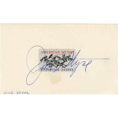 <B>Jule Styne Autograph.</B></I> A 5" x 3" card, with a five-cent commemorative postage stamp affixed, signed by the multiple Oscar-winning songwriter in blue ink. Styne's autograph extends across the face of the stamp and is large and clean. In Excellent condition.<BR><BR><b>Shipping:</b> Flat Material, Small (<a target="_blank" href="http://www.heritageauctions.com/common/shipping.php">view shipping information</a>)