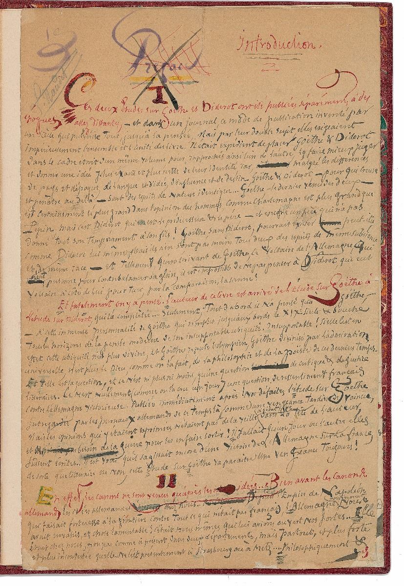 French author (1808–1889) known for his mysteries that explored hidden motivations and hinted at evil. Supremely desirable AMS in French, signed “J. B. d. A.,” five pages, 8 x 12.25, no date but circa 1880. Draft for the introduction to his 1880 pamphlet of literary criticism entitled Goethe et Diderot. In part (translated): "These two studies about Goethe and Diderot have been published separately at rather distant periods,—and in a journal, with a style of publication invented at an age pulverizing everything, even thought, but by their double subject, they imperatively required [the two studies] overall and unity of the book. It was expedient to place Goethe and Diderot within the scope of the same volume to bring them closer to each other that way, to make it a better judgment and give a more exact and clearer view of their identity because, hence differences of country and period, language and idea, influence and destiny, Goethe and Diderot—who dug and penetrated beyond—are minds of identical nature… Goethe,—the last to come of the two—is certainly the greatest in mankind opinion, as Charlemagne is greater than Pepin, but it is Diderot who is the predecessor and the father,—and yet is it [inserted] a father who has not given all his temperament to his son! Goethe, without Diderot, could exist maybe as Diderot himself, but the both of them are no less minds of same substance and same race,—and so much, than while writing about Goethe, the Voltaire of Germany, who had no one to counterbalance his glory, it is impossible not to think of Diderot, who had Voltaire next to him to kill his by comparison!” Handsomely custom-bound in dark red leather with a matching slipcase. Repaired separations to intersecting folds and a few repaired tears, uniform toning, and a bit of paper loss to corners, otherwise fine condition.
