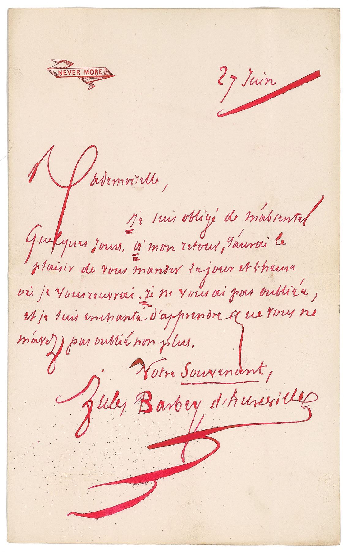 French author (1808–1889) known for his mysteries that explored hidden motivations and hinted at evil. ALS in French, one page, 5 x 8, 'Never More' letterhead, June 27, no year but circa 1880. In part (translated): "I am obliged to absent myself for a few days. Upon my return, I have the pleasure to send for you the day and time when I will receive you. I have not forgotten you, and I am delighted to learn that you have not forgotten me." In fine condition, with scattered creases. Accompanied by the original mailing envelope, addressed in Barbey d'Aurevilly's own hand, as well as a carte-de-visite portrait labeled in the lower border in his own hand.