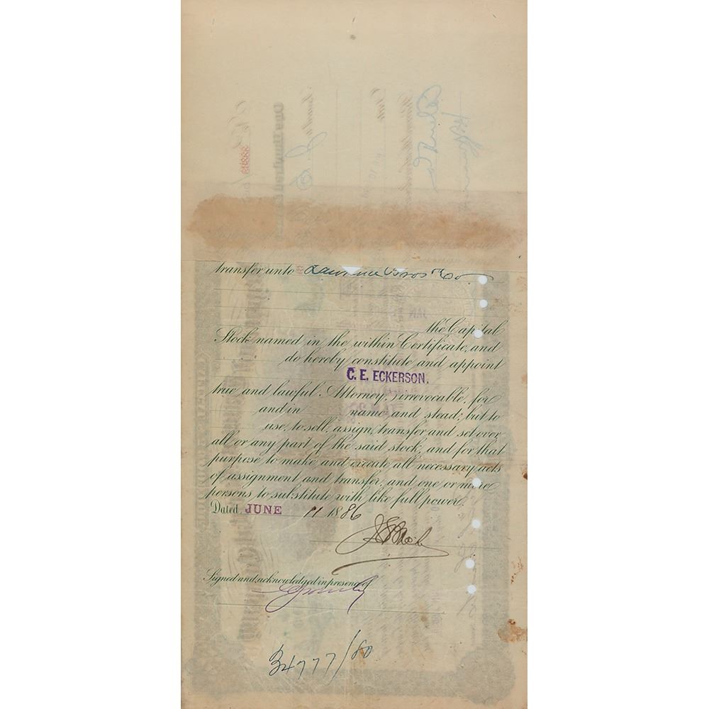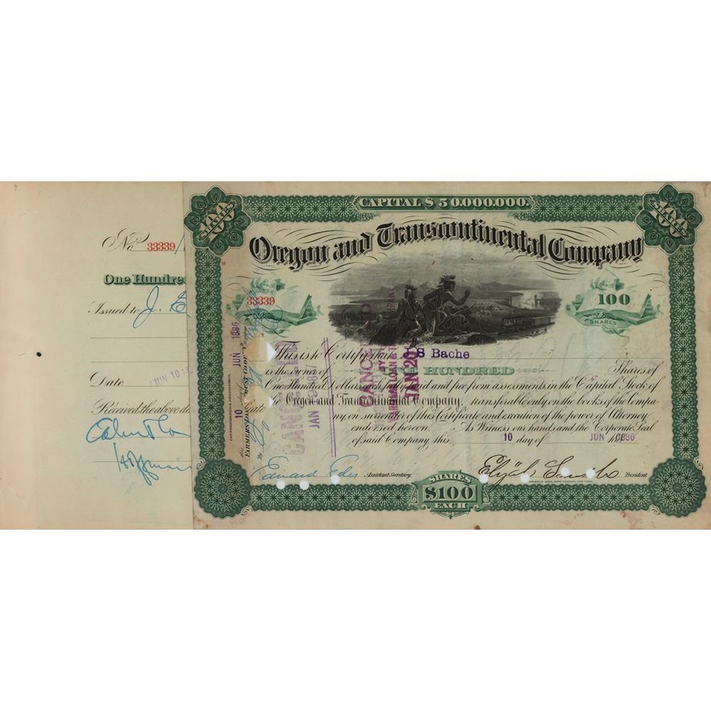 American banker, art collector, and philanthropist (1861-1944) whose stock brokerage firm, J. S. Bache & Co., was one of the top brokerage houses in the United States. Partly-printed DS, signed “J. S. Bache,” one page, 10.75 x 7, June 10, 1886. Stock certificate issued to J. S. Bache for 100 shares in the Oregon and Transcontinental Company, endorsed on the reverse by Bache to transfer the shares; the front is signed at the bottom by Elijah Smith as the company's president. The certificate boasts a handsome vignette of Native American Indians observing a train in a valley. The original receipt remains affixed to the left side. In fine condition.