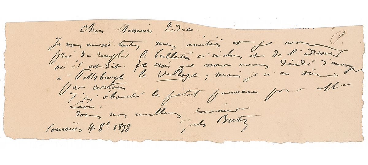 French Realist painter (1827–1906). ALS in French, on a 7.5 x 2.5 clipped slip, August 4, 1898. Letter to Mr. Tedesco. In full (translated): “I send you my very best regards and ask that you kindly fill out the enclosed certificate and mail it to the destination indicated. I believe that we have decided to send the Village to Pittsburgh, but I am not sure. I have sketched a small panel for Mr. Leon.” In fine condition, with a central vertical fold slightly affecting first letter of signature and uneven edges.