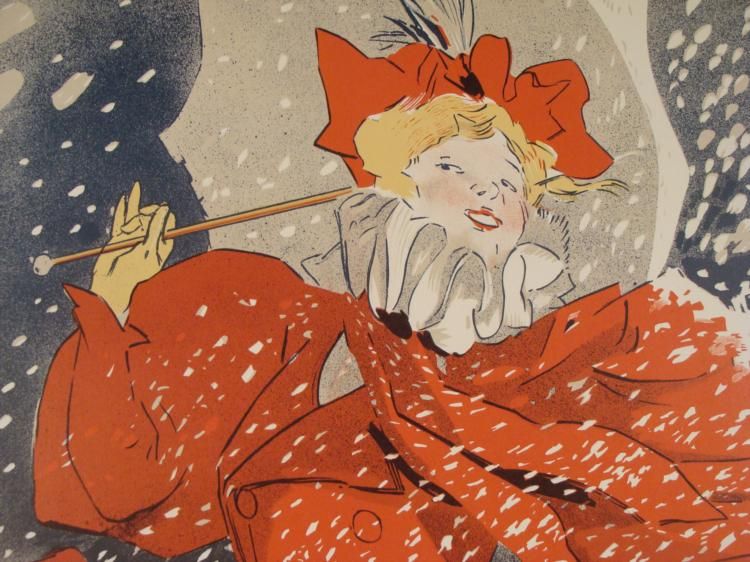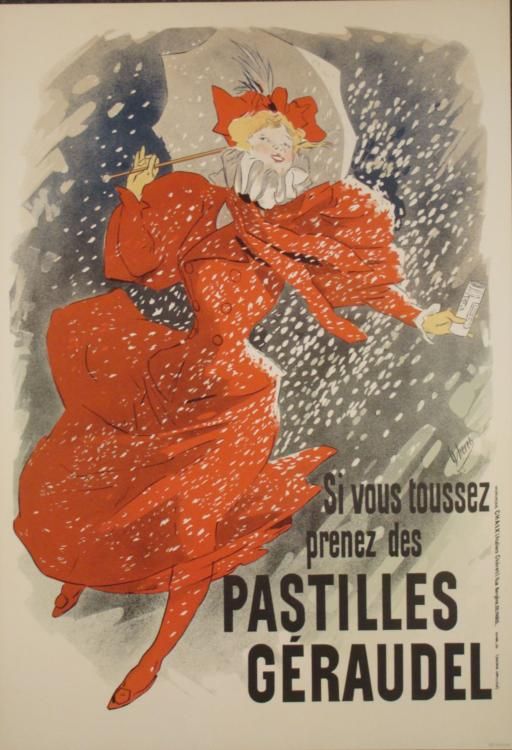A lovely lady is seen frollicking in a storm in this playful advertising image from Pastilles Geraudel candies.Artist: Jules Cheret Title: Pastilles Geraudel * Paper Size: 36 1/2 x 25 1/8 inches. Notes: Lithograph Biography Jules Cheret, 1836-1932, was born in Paris to a poor but creative family of artisans. At age thirteen, he began a three-year apprenticeship with a lithographer. After extensive training, he began creating vivid advertisement posters for cabarets, music halls, and theaters such as the Moulin Rouge. He first saw enormous lithograph posters at a World's Fair during the 1850s, and immediately recognized their artistic potential. French culture promoted poster art. Rapidly growing cities, expanded commerce and industry created new wealth among a large number of people. Cheret, the "father of the poster," elevated the medium of lithography, traditionally used primarily for the creation of books, to an artform. Cheret designed over 1000 posters, and contributed greatly to the "explosion of advertising." Cheret's skill with the medium influenced the styles of many artists, including Toulouse Lautrec.