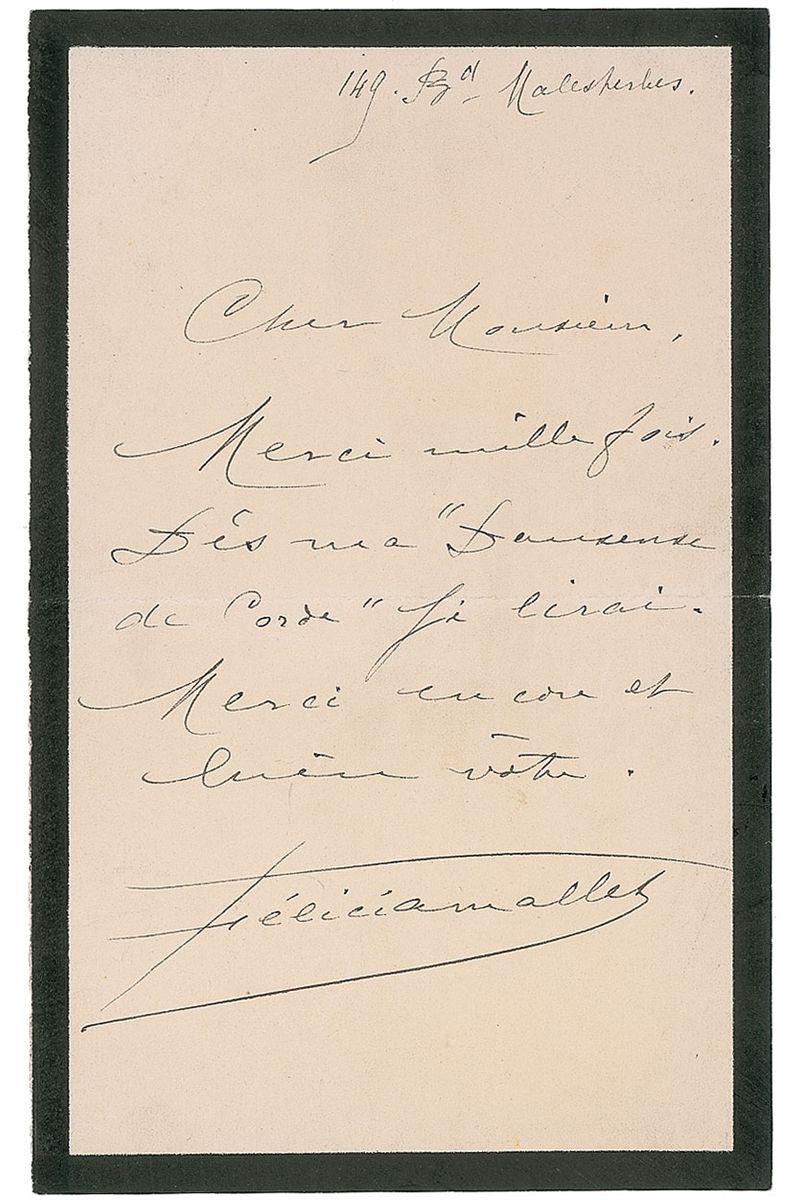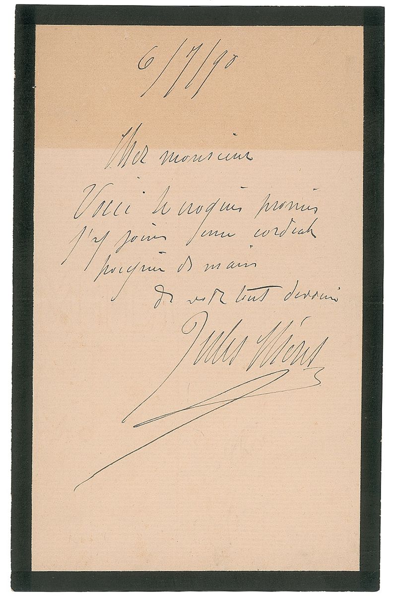 ALS in French, one page, 4.5 x 7, black-bordered letterhead, July 6, 1890. Brief letter to a gentleman. In full (translated): “Here is the sketch I promised you along with a cordial handshake from your entirely devoted Jules Cheret.” In fine condition, with a strip of toning to upper portion of letter. Accompanied by a brief letter from pantomime artist Felcia Mallet, which reads, (translated): “I will recite my ‘Danseuse de Corde’ [Tightrope Dancer].” In 1891 Cheret executed a famous poster of Mallet as the ‘La Danseuse de Corde.’ A contemporary print-out of that poster is also included.