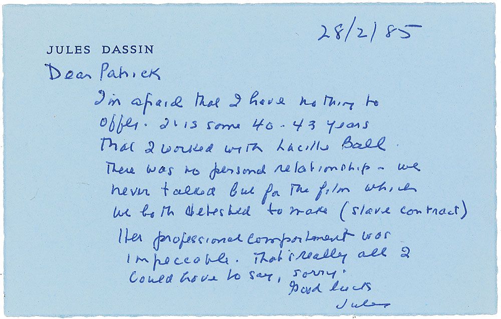 Film director (1911–2008) who moved to France after being subjected to the McCarthy-era Hollywood blacklist. ALS signed “Jules,” one page, 5.25 x 3.25, personal letterhead, February 28, 1985. Letter to author Patrick McGilligan. In part: “It is some 40–43 years that I worked with Lucille Ball. There was no personal relationship—we never talked but for the film which we both detested (slave contract). Her professional comportment was impeccable.” In fine condition. Accompanied by the original mailing envelope, filled out in Dassin’s hand.