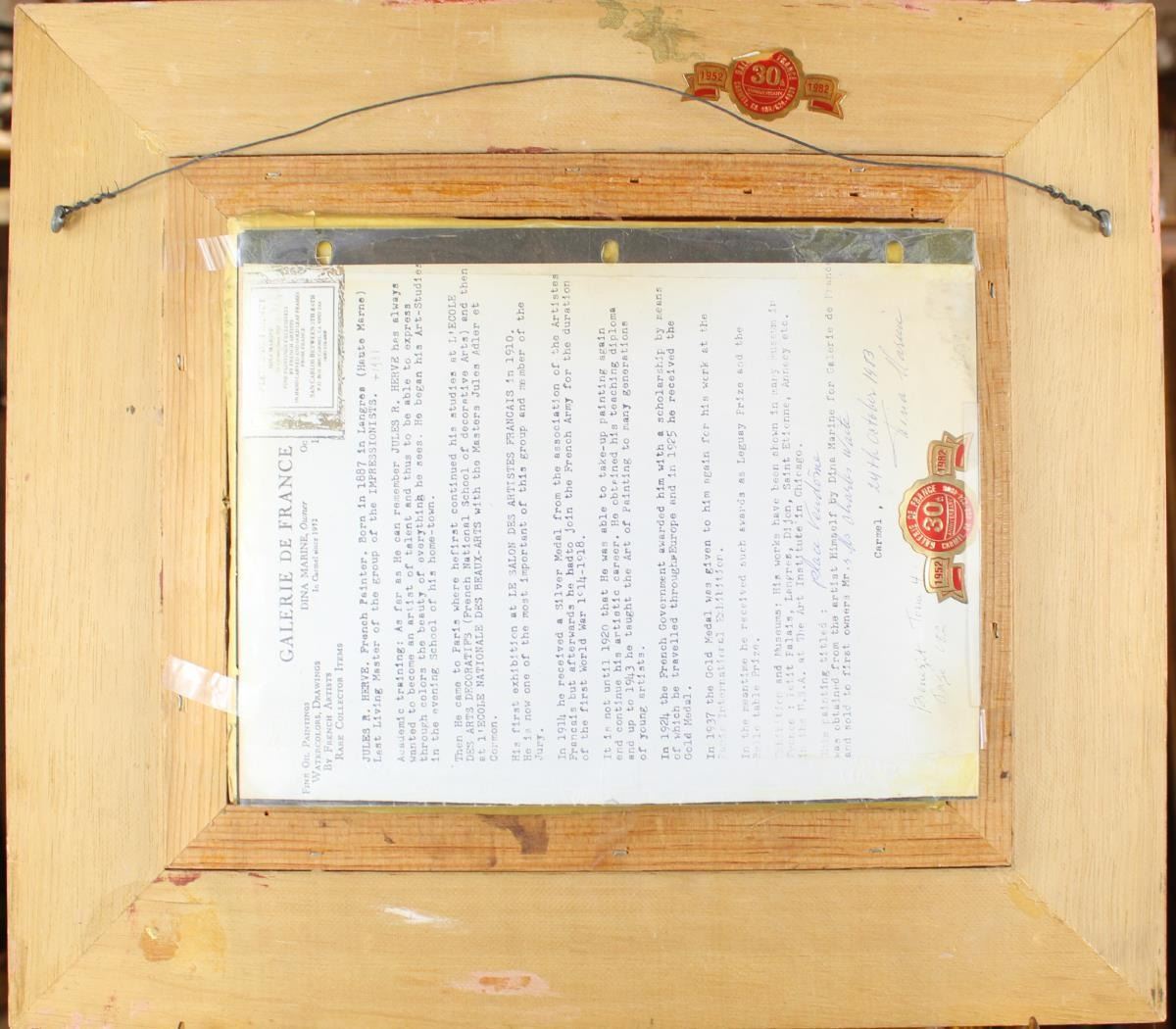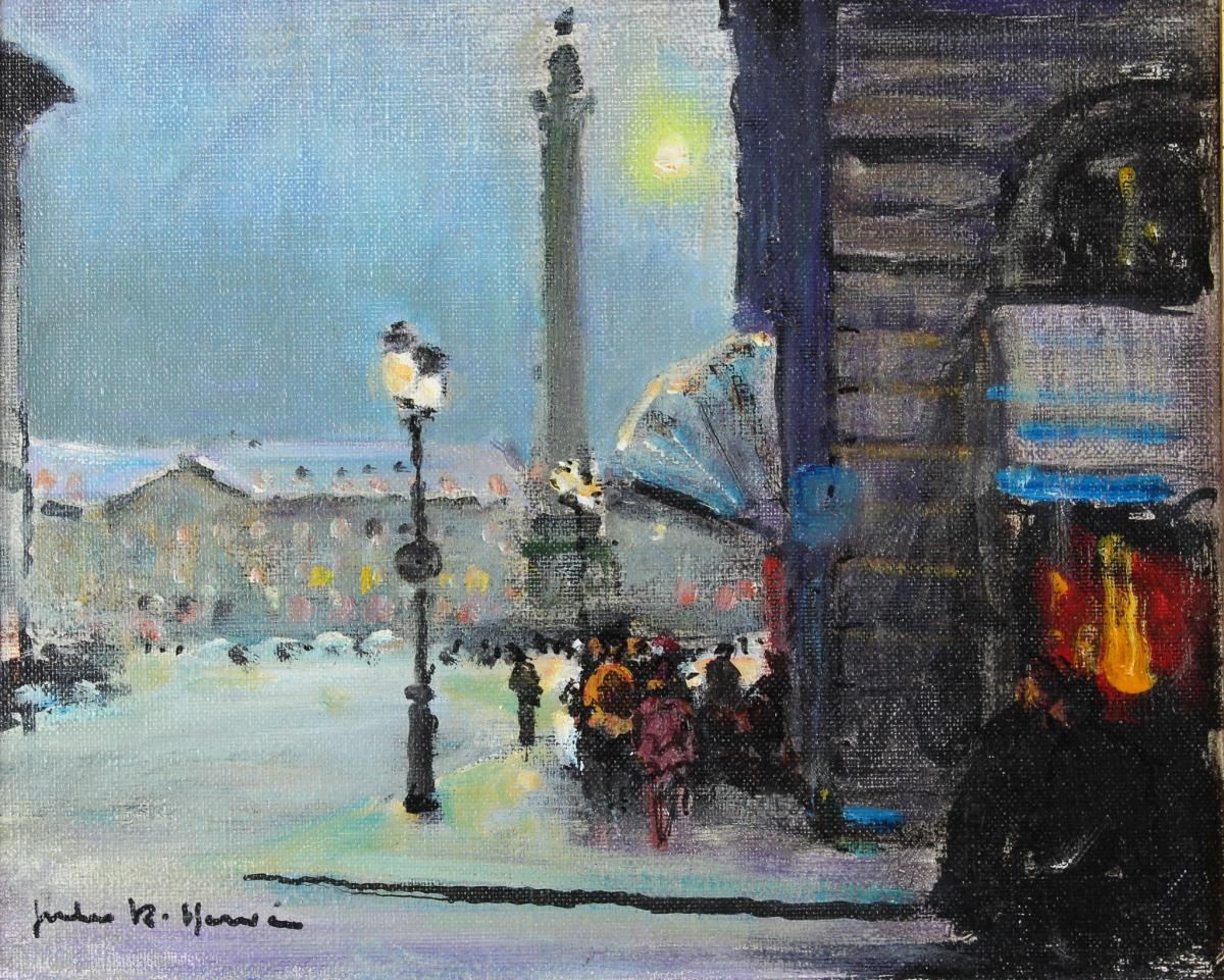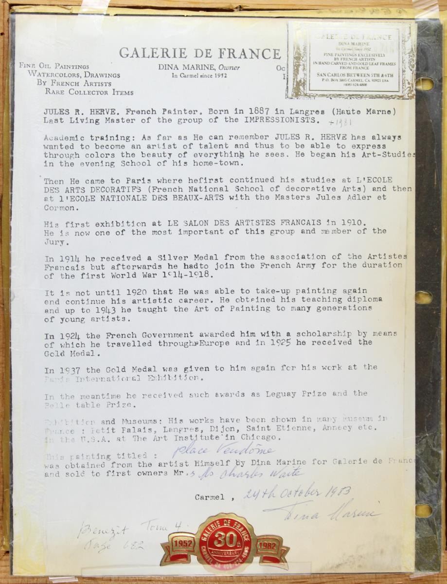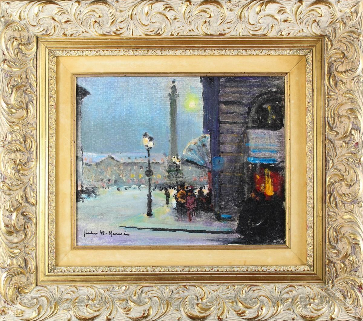 "Place Vendome", depicts a lovely Paris evening street scene, provenance verso. Jules Herve was active in France and the US, known for genre, city scene, and landscape painting.