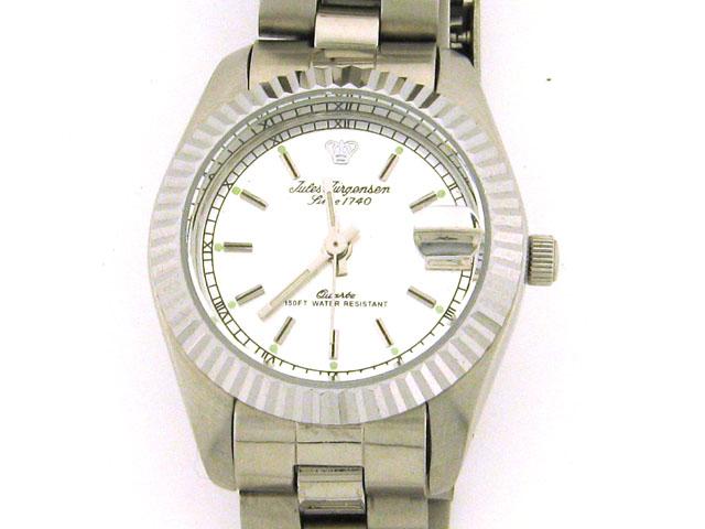 This is Jules Jurgensen 7679S watch with the following features: Mineral window; Fold-over clasp with safety; Stainless steel case; 26 mm case diameter; 7 mm case thickness; Stainless steel band; 13 mm Band width; Silver dial; Stainless steel bezel; Stationary bezel; Date calendar; Quartz movement; and Water resistant.