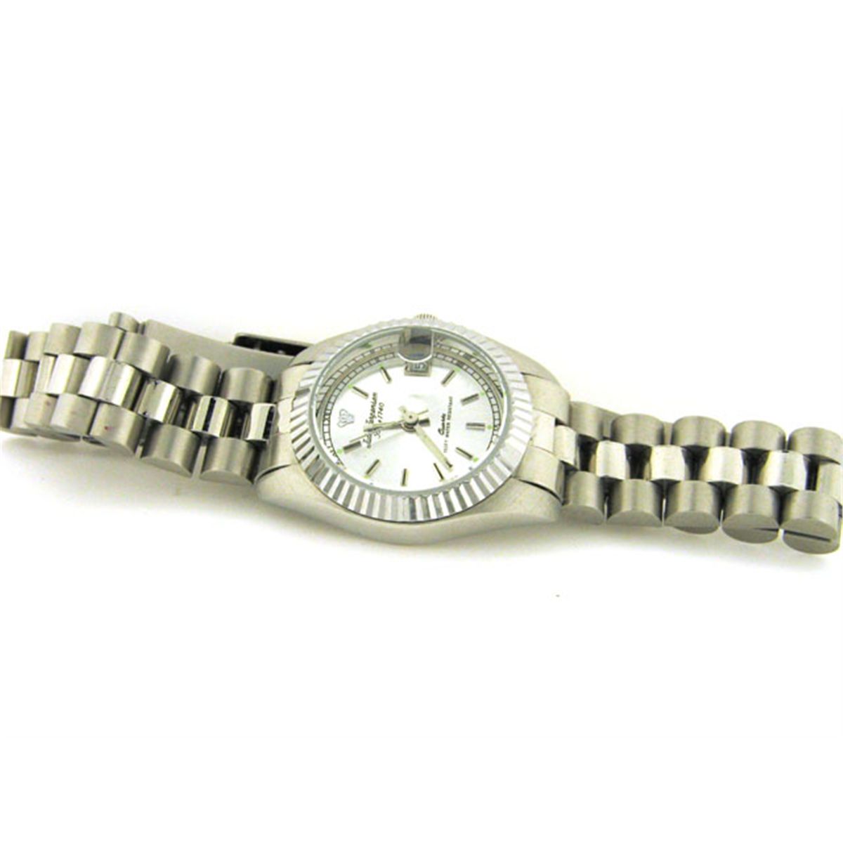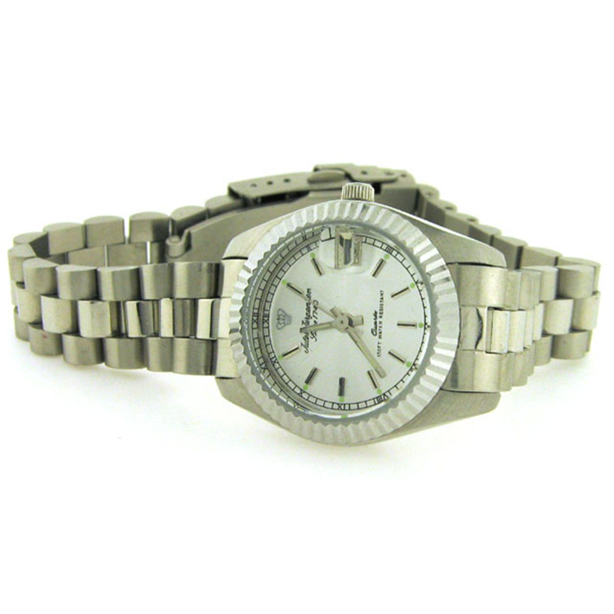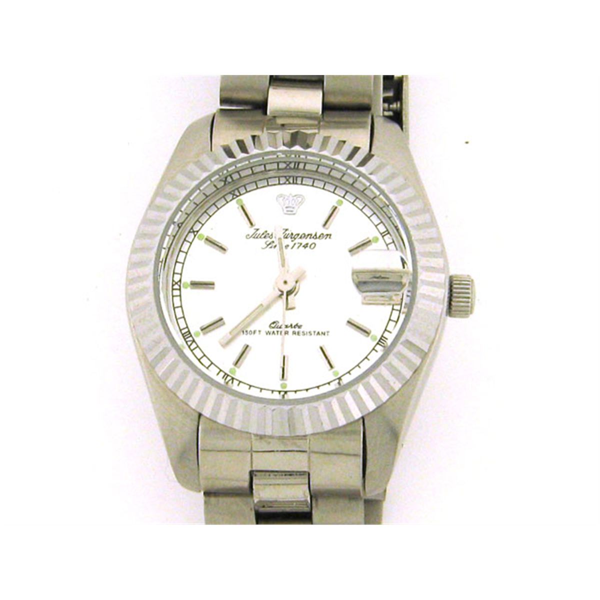 This is Jules Jurgensen 7679S watch with the following features: Mineral window; Fold-over clasp with safety; Stainless steel case; 26 mm case diameter; 7 mm case thickness; Stainless steel band; 13 mm Band width; Silver dial; Stainless steel bezel; Stationary bezel; Date calendar; Quartz movement; and Water resistant.