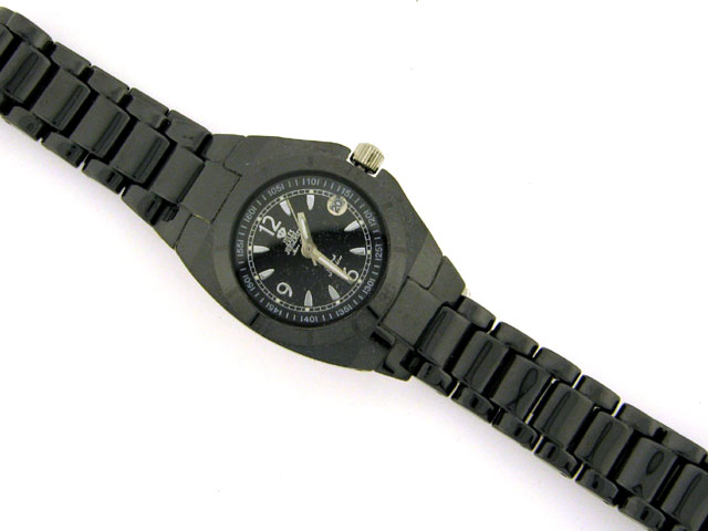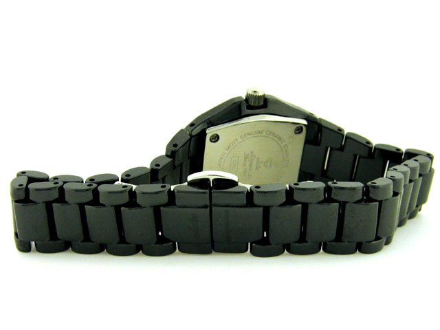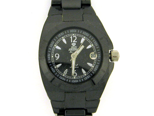 This is a Women's Jules Jurgensen Black Ceramic Calendar Watch with the following features: Black anodized stainless steel case; Ceramic stainless steel back; Black dial with luminous silvertone hands and markers; Date display; Precise quartz movement; S