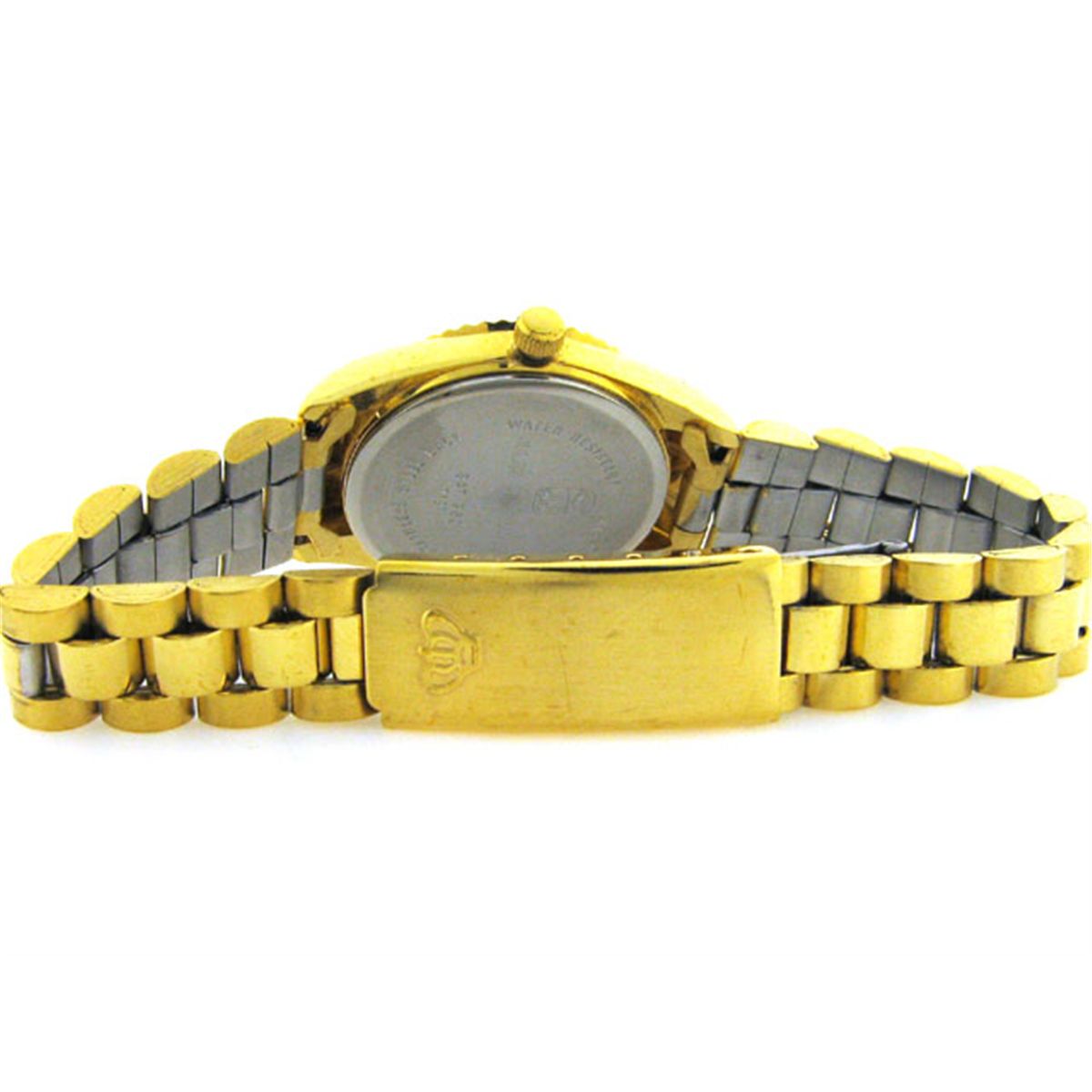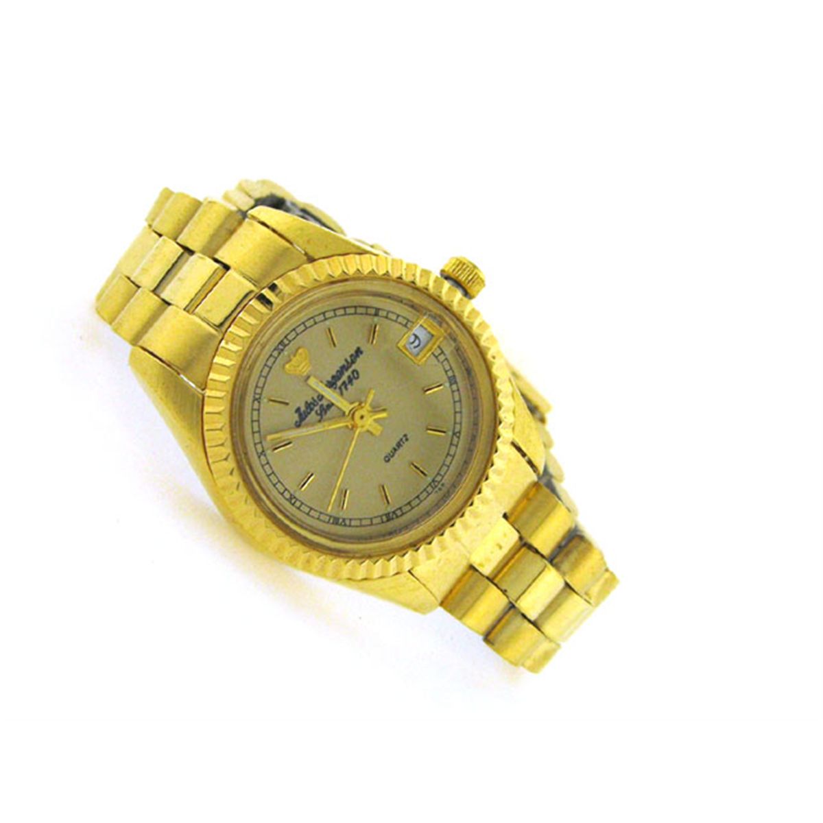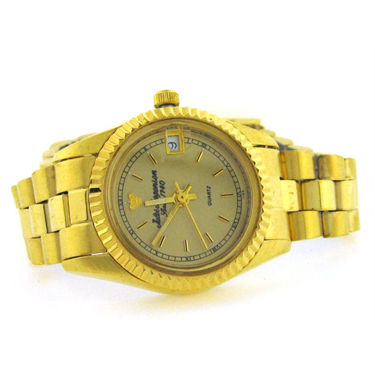 This is a Jules Jurgensen Classic Ladies Watch 7181 with the following features: Gold tone base metal case and bracelet with fold-over fastener; has Champagne/gold color dial; mineral glass crystal; Water resistant; and Quartz movement.