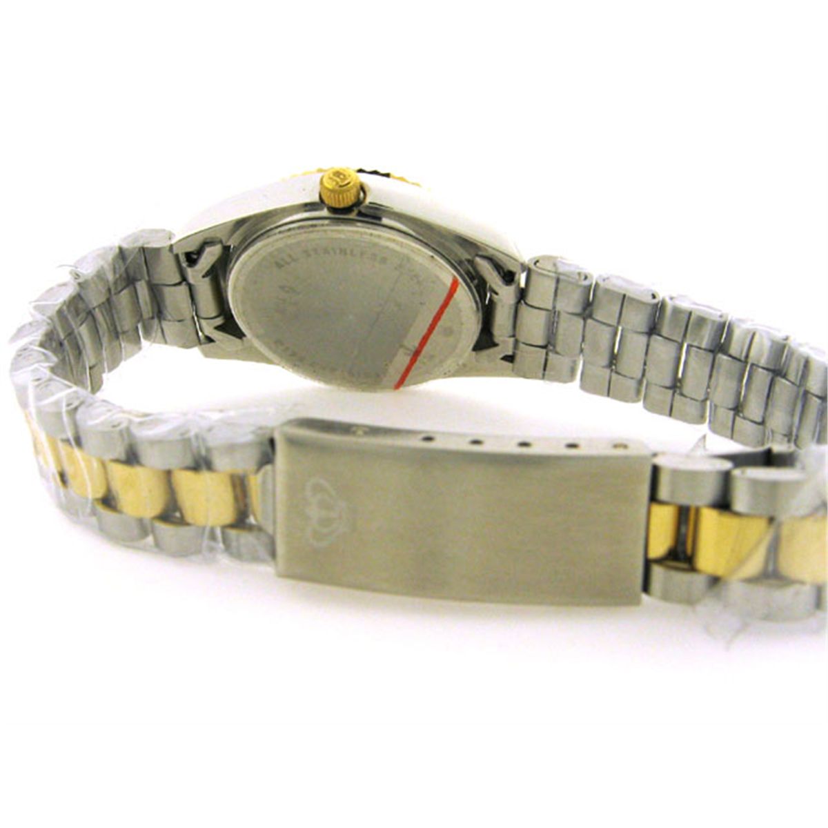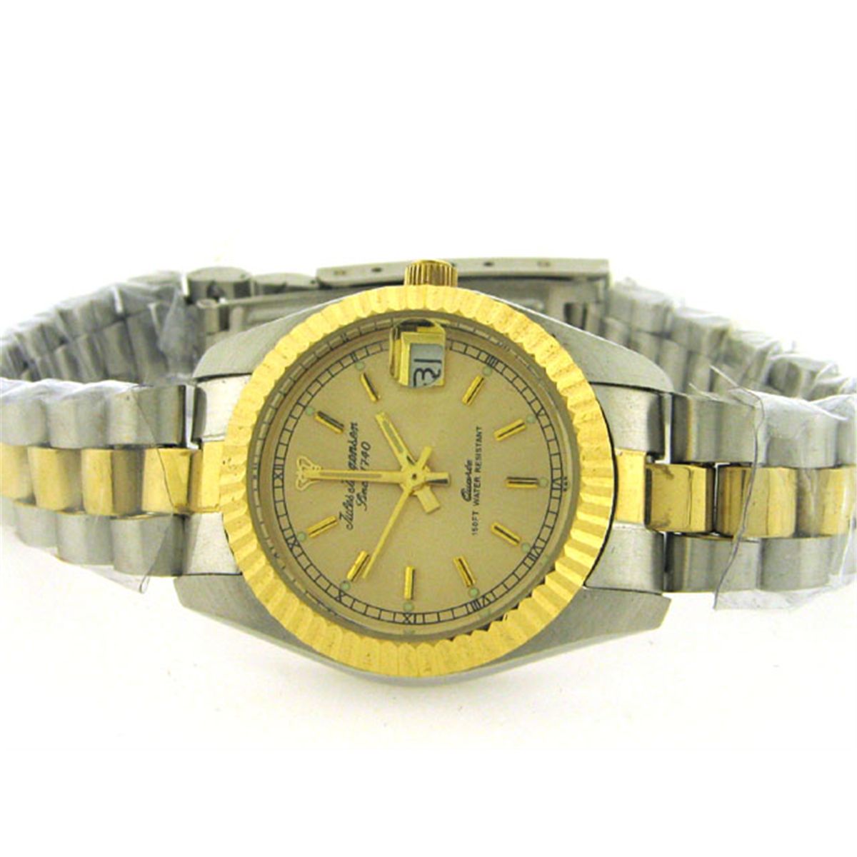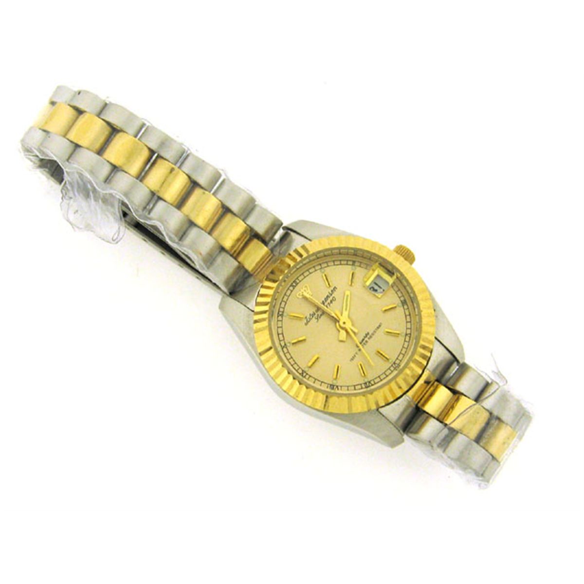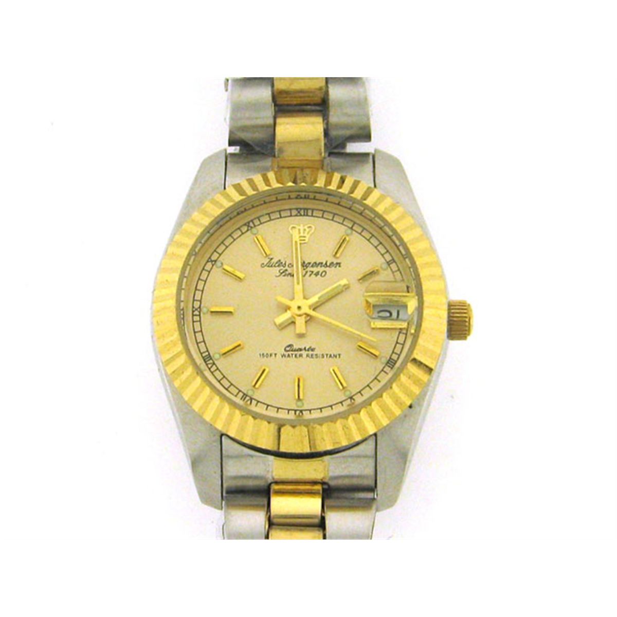 This is a Jules Jurgensen Classic Ladies Watch with the following features: Gold tone base metal case and bracelet with fold-over fastener; champagne/gold color dial; Crystal is made of mineral glass; Japan 3 hand movement with calendar; and Water resistant to 3 ATM.
