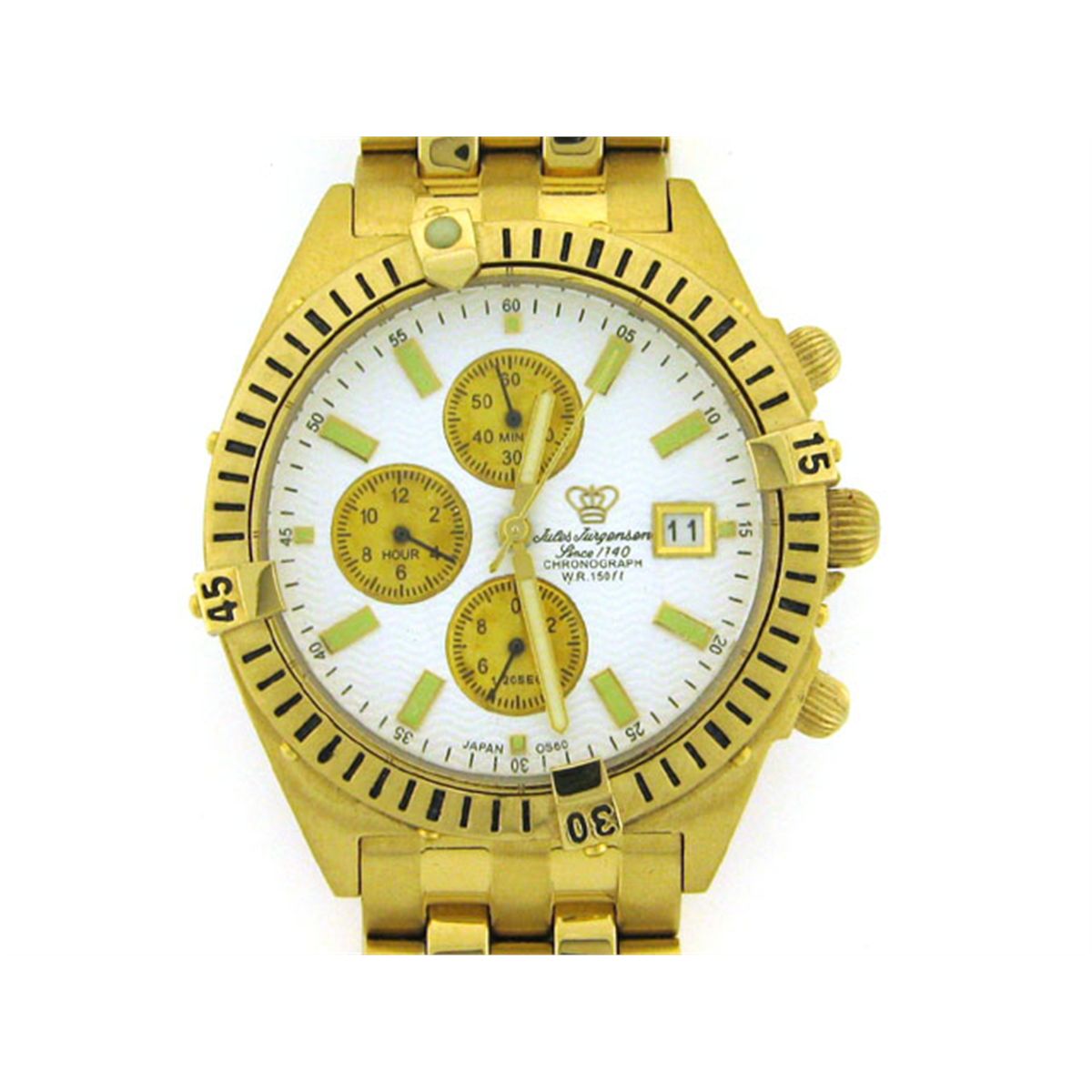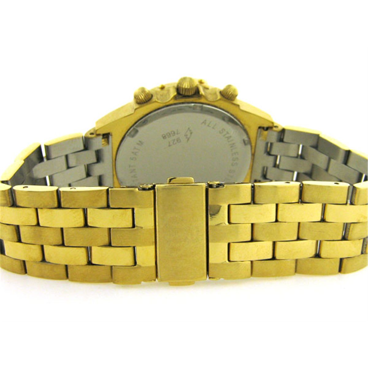 This is a Jules Jurgensen Men's 7668Y Two-Tone Chronograph Watch with the following features: Stainless steel; Water resistant; Band Color: Gold Metal; Band Width: 20mm near case; Bezel Color: Gold; Case: Gold Tonneau-shaped; Case Finish: Flat Stainless Steel; Case Thickness: 12mm; Case Width: 39mm; 40mm with crown; Clasp / Buckle: Deployment; Dial: White analog; Hand Color: Glow-in-the-dark; Movement: Japanese quartz; Time Zones: Single; Water Resistance: 1 atm.