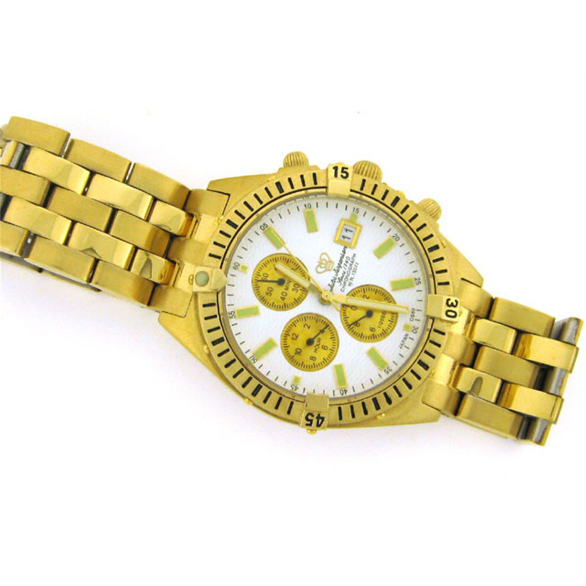 This is a Jules Jurgensen Men's 7668Y Two-Tone Chronograph Watch with the following features: Stainless steel; Water resistant; Band Color: Gold Metal; Band Width: 20mm near case; Bezel Color: Gold; Case: Gold Tonneau-shaped; Case Finish: Flat Stainless Steel; Case Thickness: 12mm; Case Width: 39mm; 40mm with crown; Clasp / Buckle: Deployment; Dial: White analog; Hand Color: Glow-in-the-dark; Movement: Japanese quartz; Time Zones: Single; Water Resistance: 1 atm.