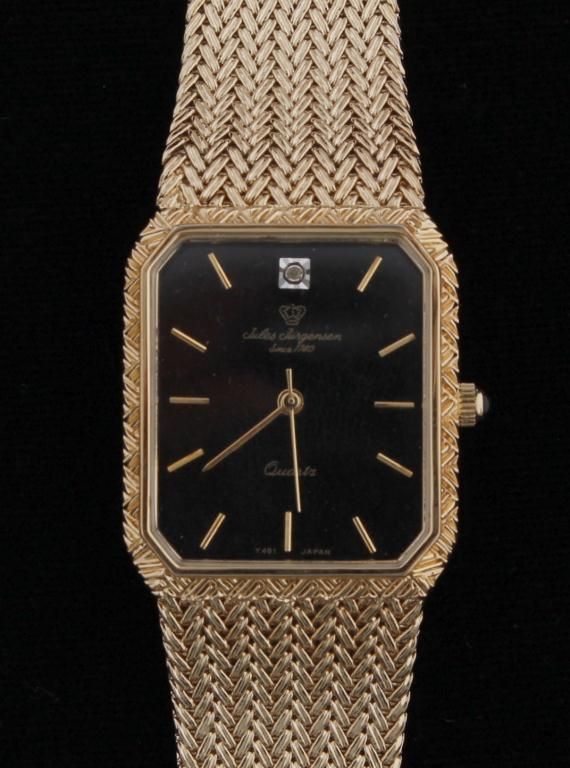 Jules Jurgensen Quartz WristwatchWith what appears to be a diamond solitaire mounted on a black face, made by the Oleg Cassini Company, in unknown working condition.