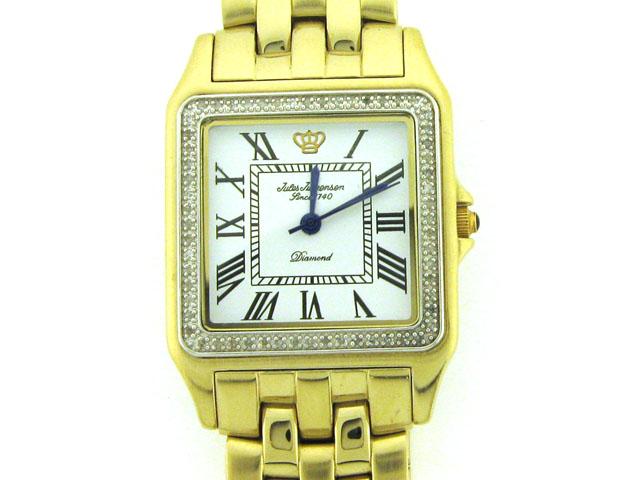 This is a Jules Jurgensen Watch with the following features: Sixty diamonds Stones (1/3 ct. t.w. diamonds) on the bezel; White dial color; Gold tone metal alloy bracelet; Hidden butterfly clasp; Analog movement; 30 mm case width; 7 mm case thickness; a