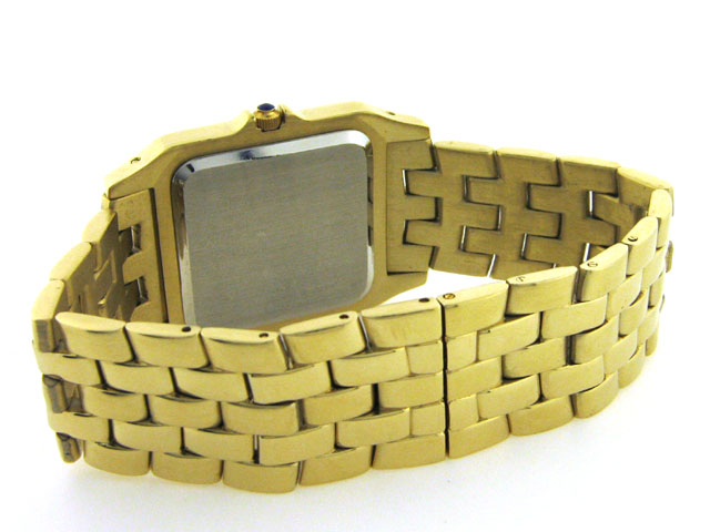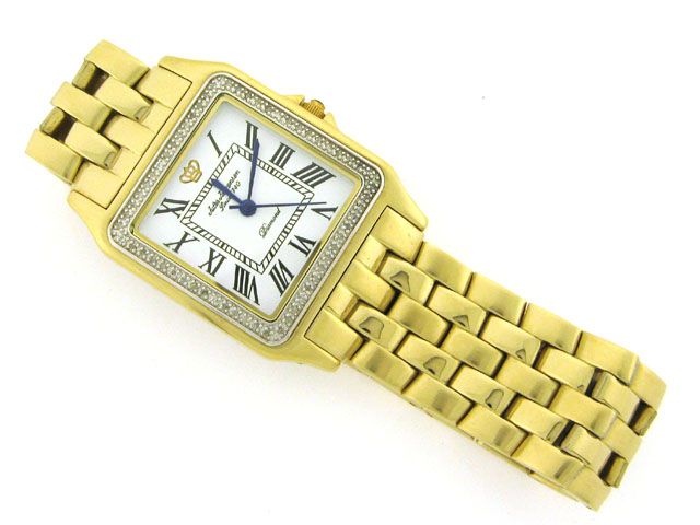 This is a Jules Jurgensen Watch with the following features: Sixty diamonds Stones (1/3 ct. t.w. diamonds) on the bezel; White dial color; Gold tone metal alloy bracelet; Hidden butterfly clasp; Analog movement; 30 mm case width; 7 mm case thickness; and 8.25 inches long X 19 mm wide Band width.