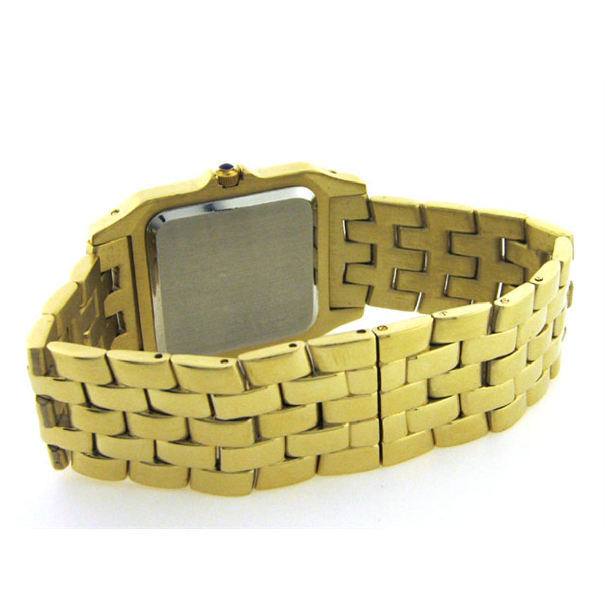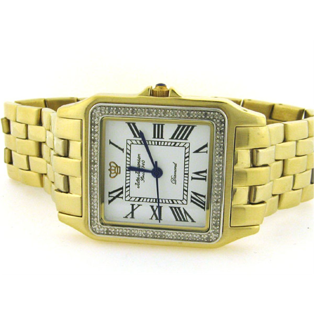 This is a Jules Jurgensen Watch with the following features: Sixty diamonds Stones (1/3 ct. t.w. diamonds) on the bezel; White dial color; Gold tone metal alloy bracelet; Hidden butterfly clasp; Analog movement; 30 mm case width; 7 mm case thickness; and 8.25 inches long X 19 mm wide Band width.