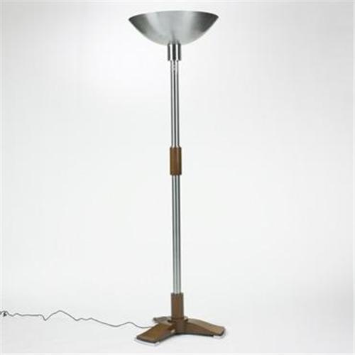 Jules Leleu<BR>torchiere<BR>France, c. 1933<BR>aluminum, red oak<BR>20 dia x 69.5 h inches<BR>Signed with applied manufacturer's mark to base.<BR>Literature: <BR><i>The Decorative Arts in France: La Societe des Artistes Decorateurs 1900-1942</i>, Brunhammer and Tise, pg. 251 illustrates related form<BR><BR>Condition of the item is not included in this description. Condition reports are available from Wright upon request. Wright strongly recommends that you review a condition report for each item on which you plan to bid.