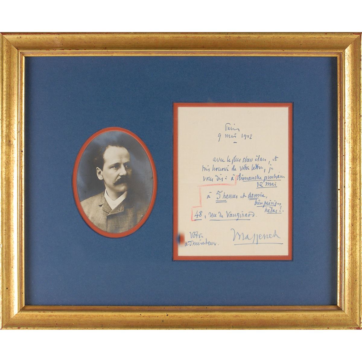 French composer (1842–1912) best known for such operas as ‘Manon,’ ‘Werther,’ and ‘Thais.’ ALS in French, signed “Massenet,” one page, 4.5 x 6, May 9, 1912. Letter to a friend, in part (translated): “With the greatest joy, and being very honored by your letter, I say to you: See you next Sunday, 12 May, at 5:30 (sharp, alas!), 48 rue de Vaugirard.” Double-matted and framed with a head-and-shoulders photograph of the composer to an overall size of 15 x 12. In fine condition, with a red pencil notation within the body of the text. Having suffered abdominal cancer for months, Massenet’s condition worsened sharply following a visit to his doctor in Paris. He died days later at the age of 70, only a few months after writing this letter.