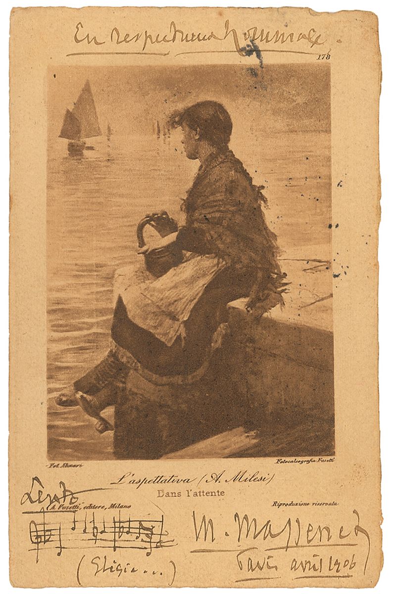 French composer (1842–1912) best known for such operas as ‘Manon,’ ‘Werther,’ and ‘Thais.’ AMQS on a 3.5 x 5.5 picture postcard with an image of Milesi’s L'aspettativa. Massenet pens two bars of music in the bottom border, labeling the top “Testo,” and signed “M. Massenet, Paris, avril 1906,” adding a brief sentiment to the top border. In very good condition, with uniform toning, light edge wear, a bit of soiling, and mounting remnants to reverse.