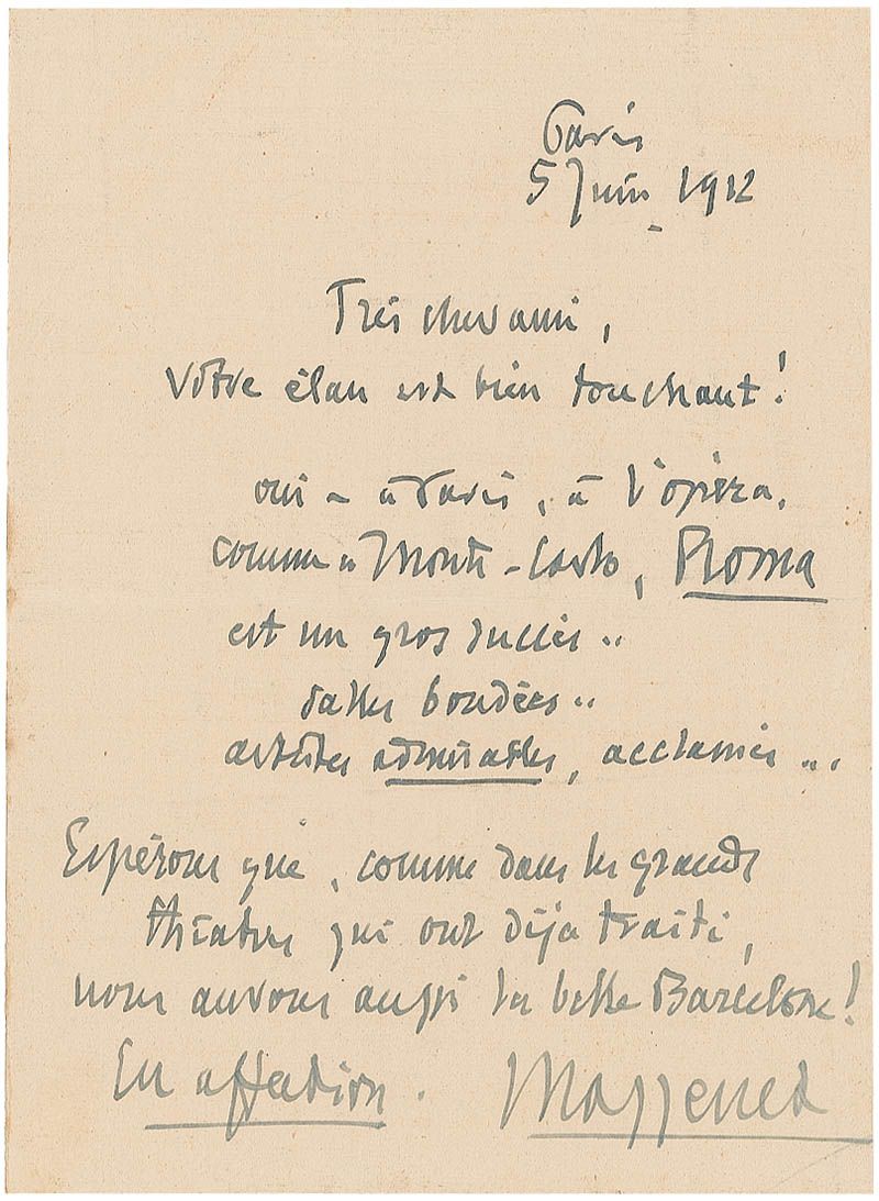 French composer (1842–1912) best known for such operas as ‘Manon,’ ‘Werther,’ and ‘Thais.’ ALS in French, signed “Massenet,” one page, 4.75 x 6, June 5, 1912. Untranslated letter written from Paris to a friend. In fine condition, with a central horizontal fold and a bit of scattered light toning and soiling.