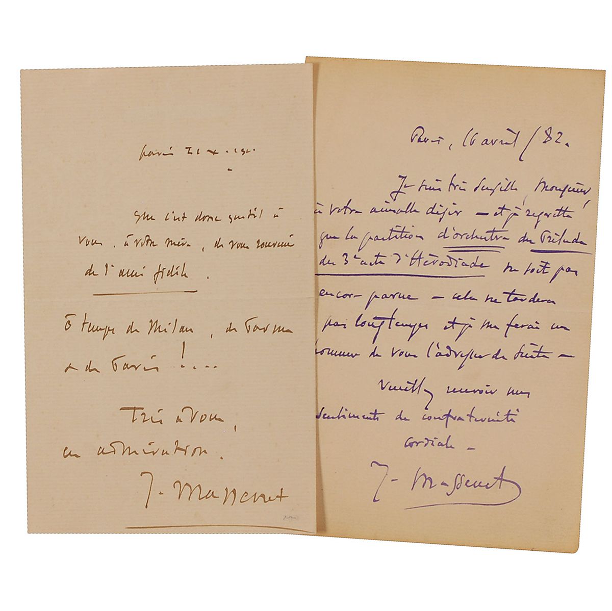 Two letters, each in French, each signed “J. Massenet”: ALS, April 16, 1882, to a fellow composer. “I regret that the orchestral score of the Prelude to the 3rd Act of Herodiade hasn’t appeared yet—it won’t be long now and I will consider it an honor to send it to you immediately. Please accept my expression of collegiality”; and an ALS, October 21, 1902, “How very nice of you and your mother to remember your faithful friend. -- O those days in Milan, Parma, and Paris!” In fine condition, with some mild toning. Accompanied by an unsigned Henri Manuel postcard photo.