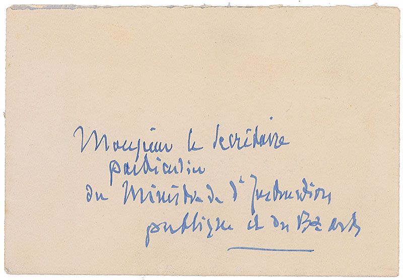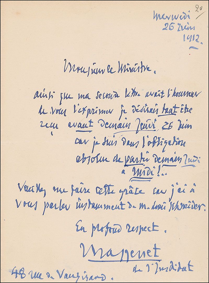 French composer (1842–1912) best known for such operas as ‘Manon,’ ‘Werther,’ and ‘Thais.’ ALS in French, signed “Massenet,” one page, 5.25 x 7, June 26, 1912. Letter to a gentleman asking for a new appointment to discuss urgently the matter of Mr. Leon Schneider. In fine condition, with a bit of scattered light toning. Accompanied by the original mailing envelope addressed in Massenet’s hand.