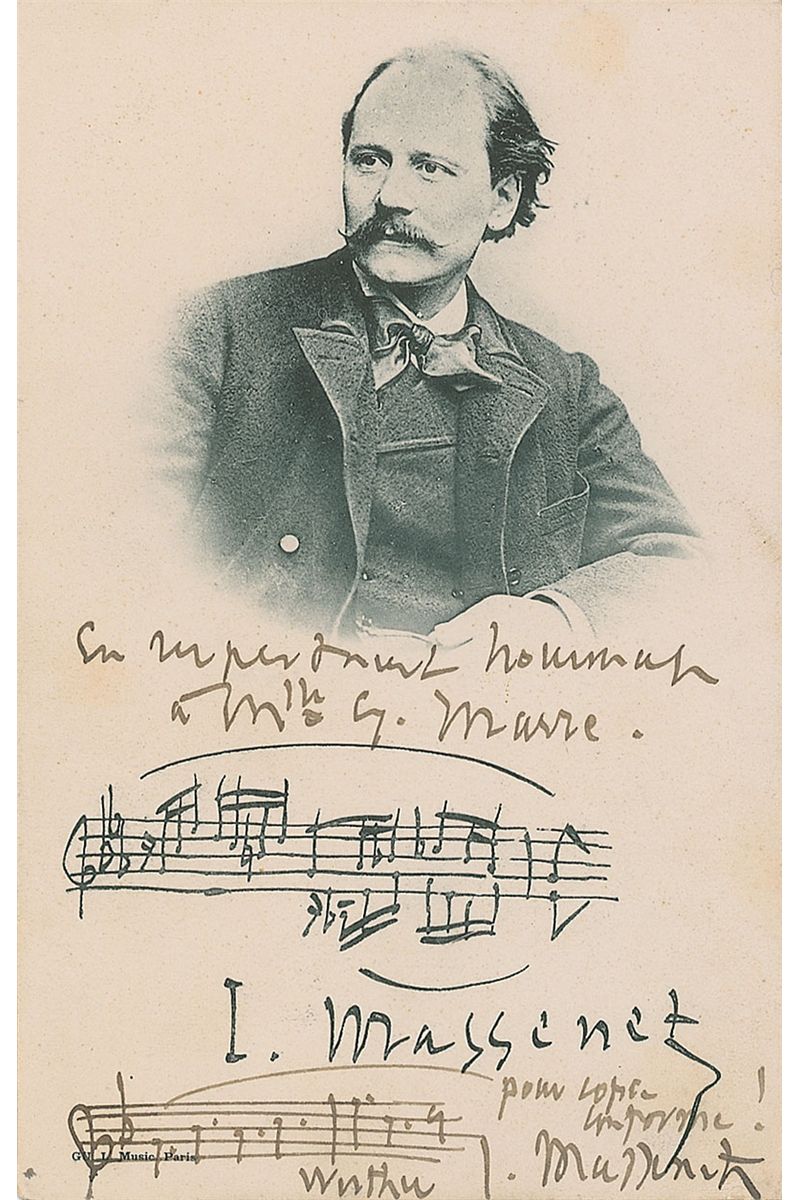 AMQS on an off-white 3.5 x 5.5 photo of the composer, which also bears a pre-printed signature and musical quote. Massenet pens two bars of music from ‘Werther,’ inscribing above, in French, “In respectful hommage to Mlle G. Marre,” and signed, “certified correct copy! Massenet.” In fine condition.