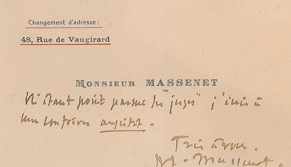 ANS in French, signed “M. Massenet,” on one of his 4 x 2.25 personal calling cards, no date but circa 1903–04. Short 12-word untranslated note. In fine condition, with a uniform shade of mild toning and Massenet’s address underlined in red ink.