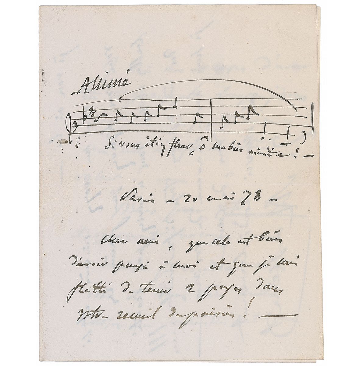 ALS in French, signed “J. Massenet,” three pages on two adjoining sheets, 4.25 x 5.25, May 20, 1878. Untranslated letter beginning with a neatly penned two-bar AMQS, featuring music and lyrics. In fine condition.
