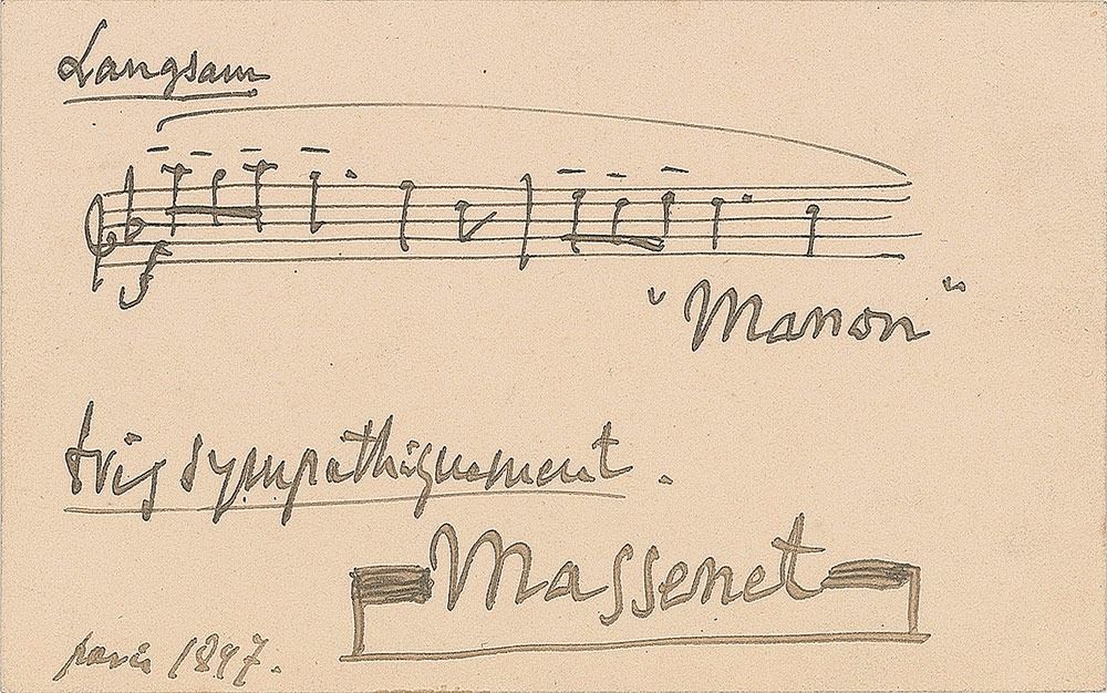 French composer (1842-1912) best known for such operas as 'Manon,' 'Werther,' and 'Thais.' AMQS on an off-white 4 x 2.5 card, signed and dated below in ink, "Très sympathiquement, Massenet, Paris 1897." Massenet pens two bars of music from his classic opera "Manon," adding above, "Langsam [slowly]." In fine condition.