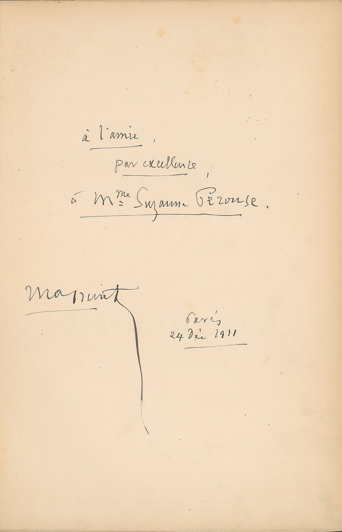 Signed score book: Cendrillon: A Fairy Tale in Four Acts. Paris: Heugel & Co., 1899. Softcover, 8 x 11.25, 361 pages. Signed and inscribed on the first free end page in black ink (translated), "To my friend, par excellence, to Mme. Suzanne Perouse, Massenet, Paris 24 Dec. 1911." Housed in a handsome custom-made clamshell case. In fine condition, with some light wear to the ornate cover, and professional repairs to splitting along the front inner hinge. Perouse was president of the French Women's Union, a branch of the French Red Cross before 1940.