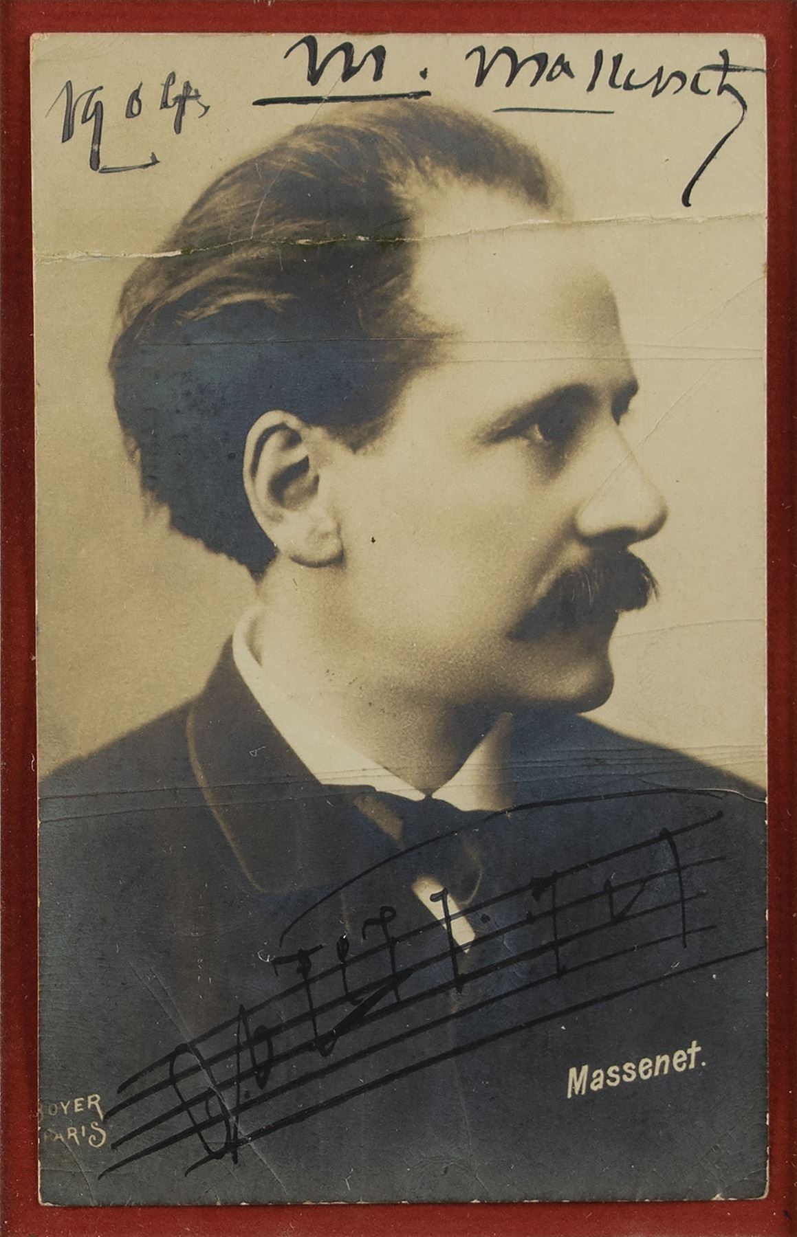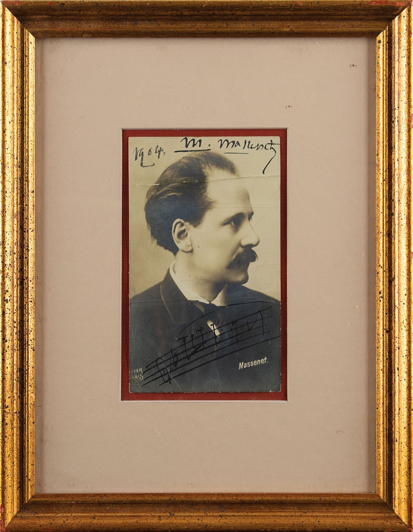 Desirable vintage matte-finish 3.25 x 5.25 postcard photo of the composer, signed along the top in thick ink, "1904, M. Massenet," with a musical quotation penned across his chest. Mounted, matted, and framed to an overall size of 9 x 11. In very good condition, with several horizontal creases, the heaviest of which passes across Massenet's forehead.