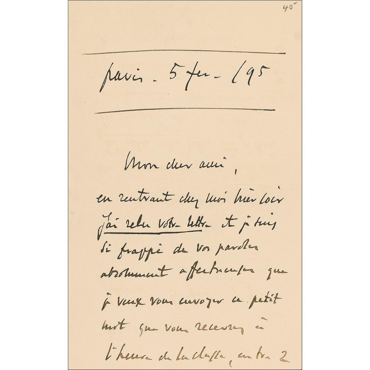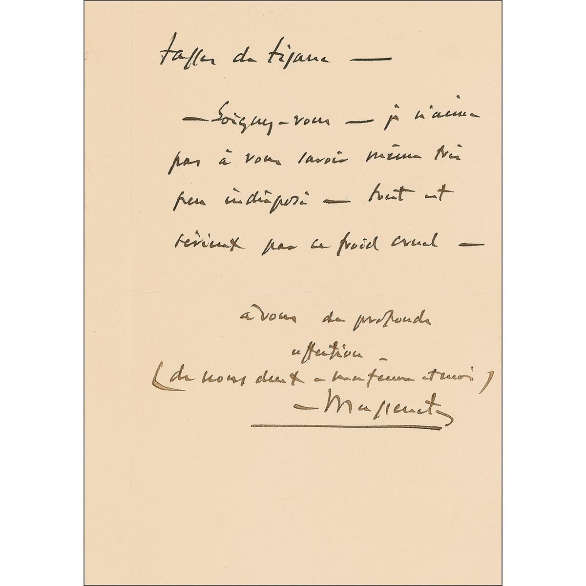 French composer (1842–1912) best known for such operas as ‘Manon,’ ‘Werther,’ and ‘Thais.’ ALS in French, signed “Massenet,” two pages on two adjoining sheets, 4.5 x 7, November 5, 1895. Untranslated letter to his pupil, musical child prodigy Reynaldo Hahn of Paris. In fine condition. Accompanied by the original mailing envelope.