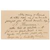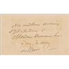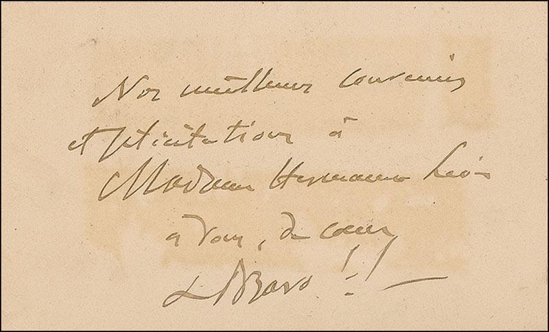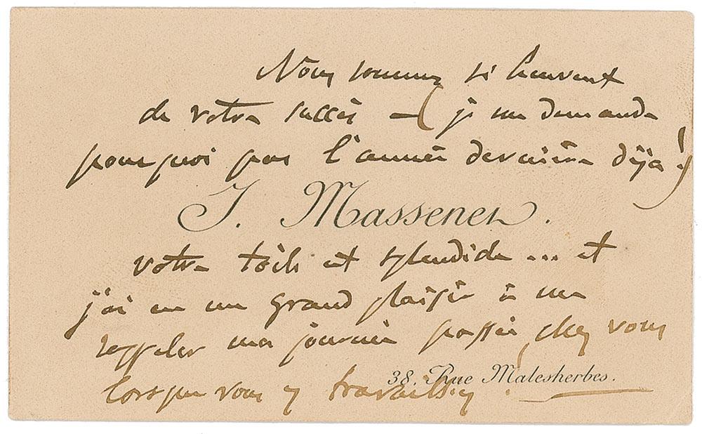French composer (1842–1912) best known for such operas as ‘Manon,’ ‘Werther,’ and ‘Thais.’ ANS in French, not signed “Massenet,” but ostensibly signed with an appellation known to the recipient, on both sides of his personal calling card, 4 x 2.5, no date, but circa 1870s. In part (translated): “Your painting is splendid…and I have a great pleasure to recall my one day spent in your home when you worked there …congratulations…to you, from the heart (’a Vous, de Coeur’).” Scattered toning to both sides, otherwise fine condition.