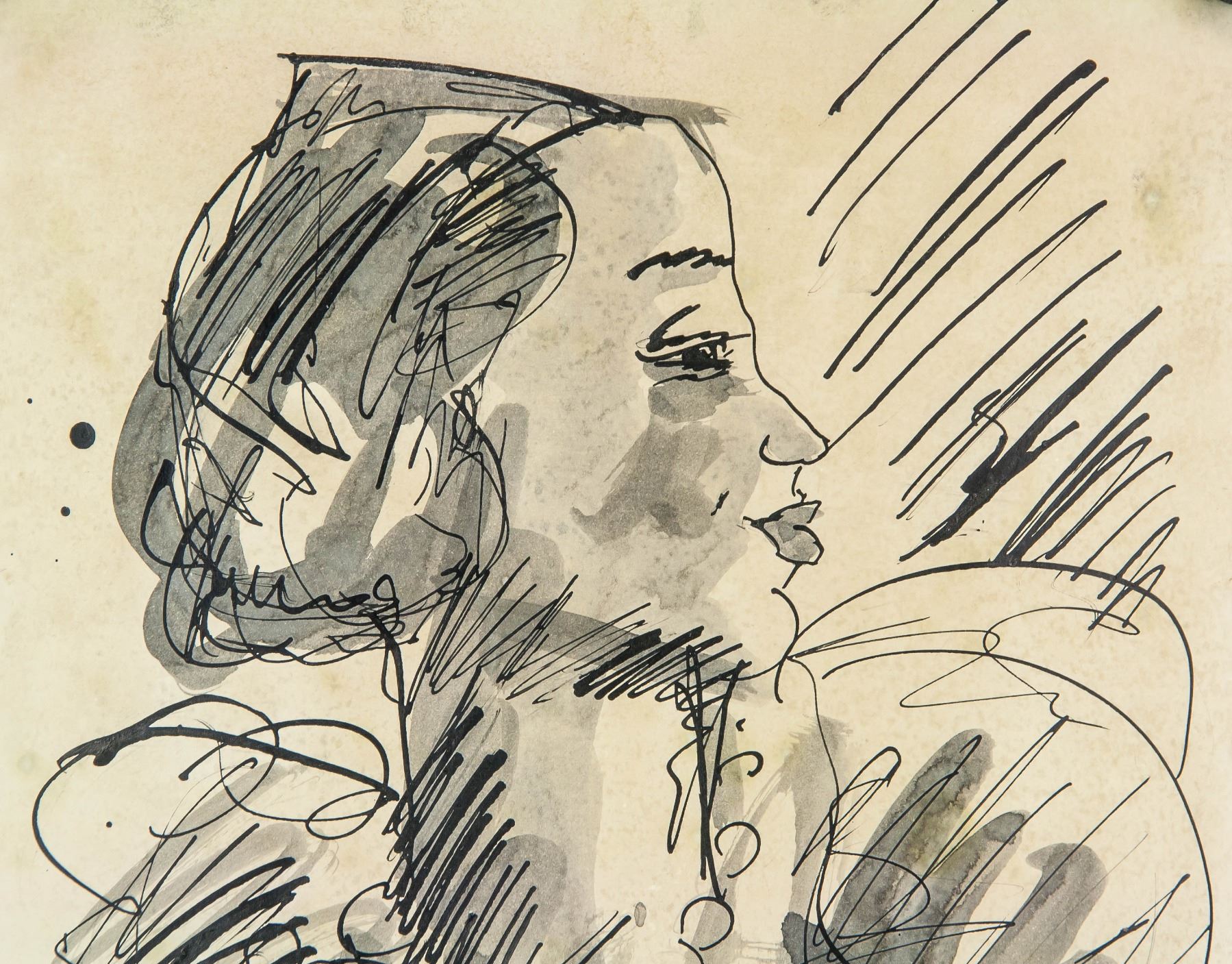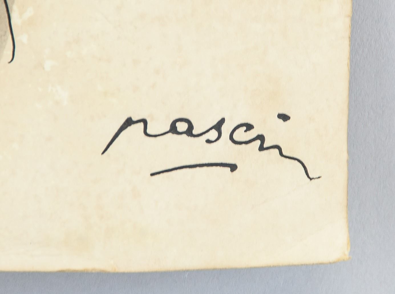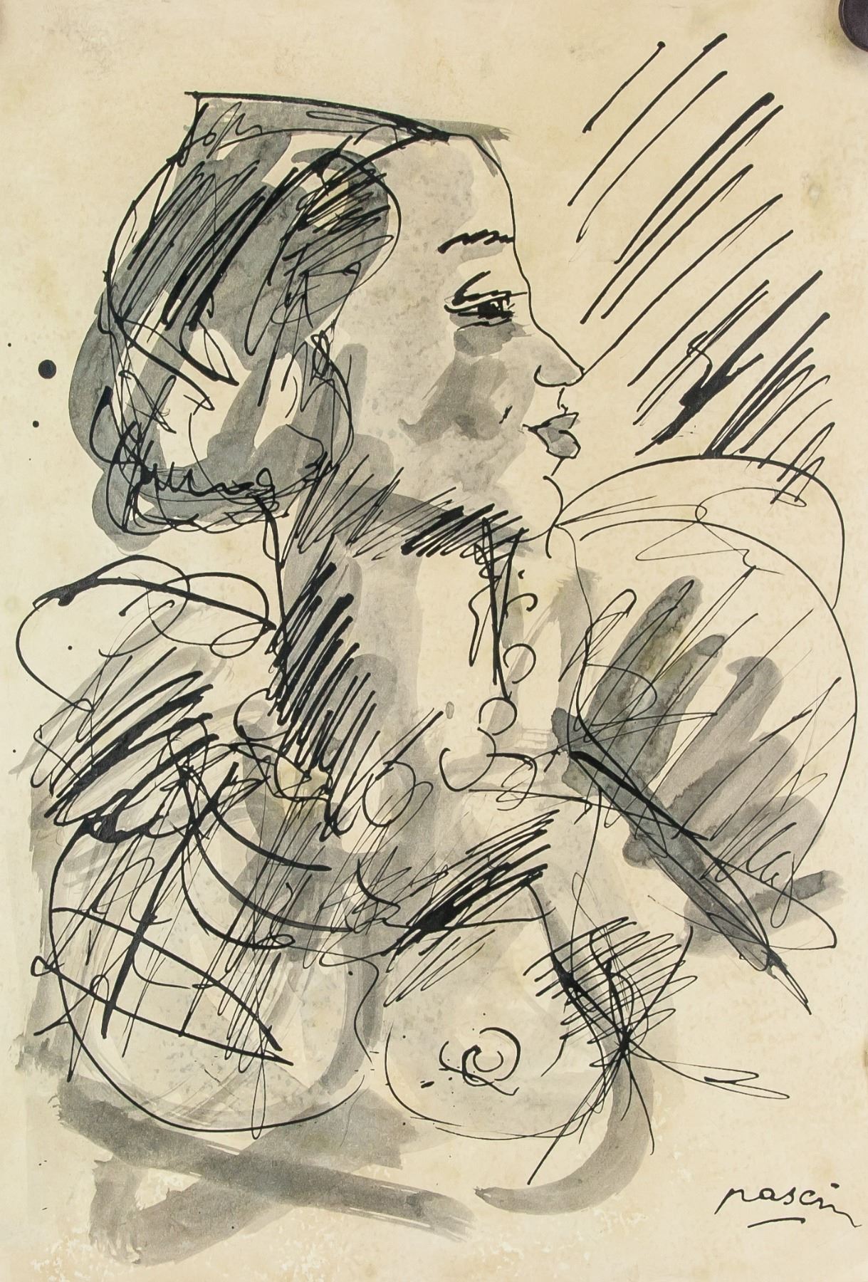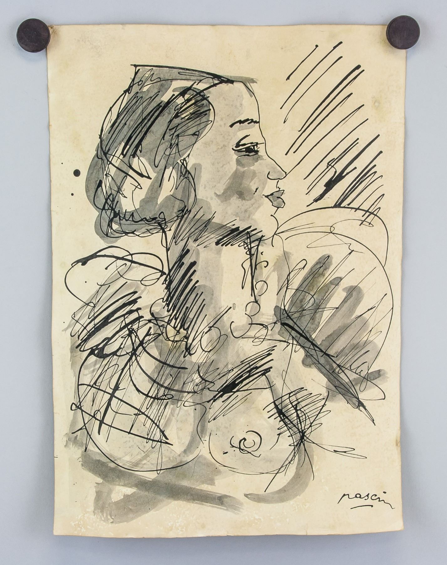 Ink on paper. Featuring a portrait of a woman. Signed Pascin on the lower right corner. Attributed to Jules Pascin 1885-1930 Bulgarian born French. 11.5 x 8.25 inch (29.2 x 30 cm). PROVENANCE: Private European estate