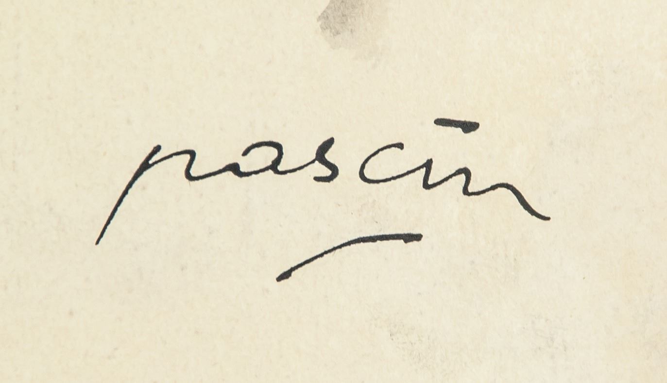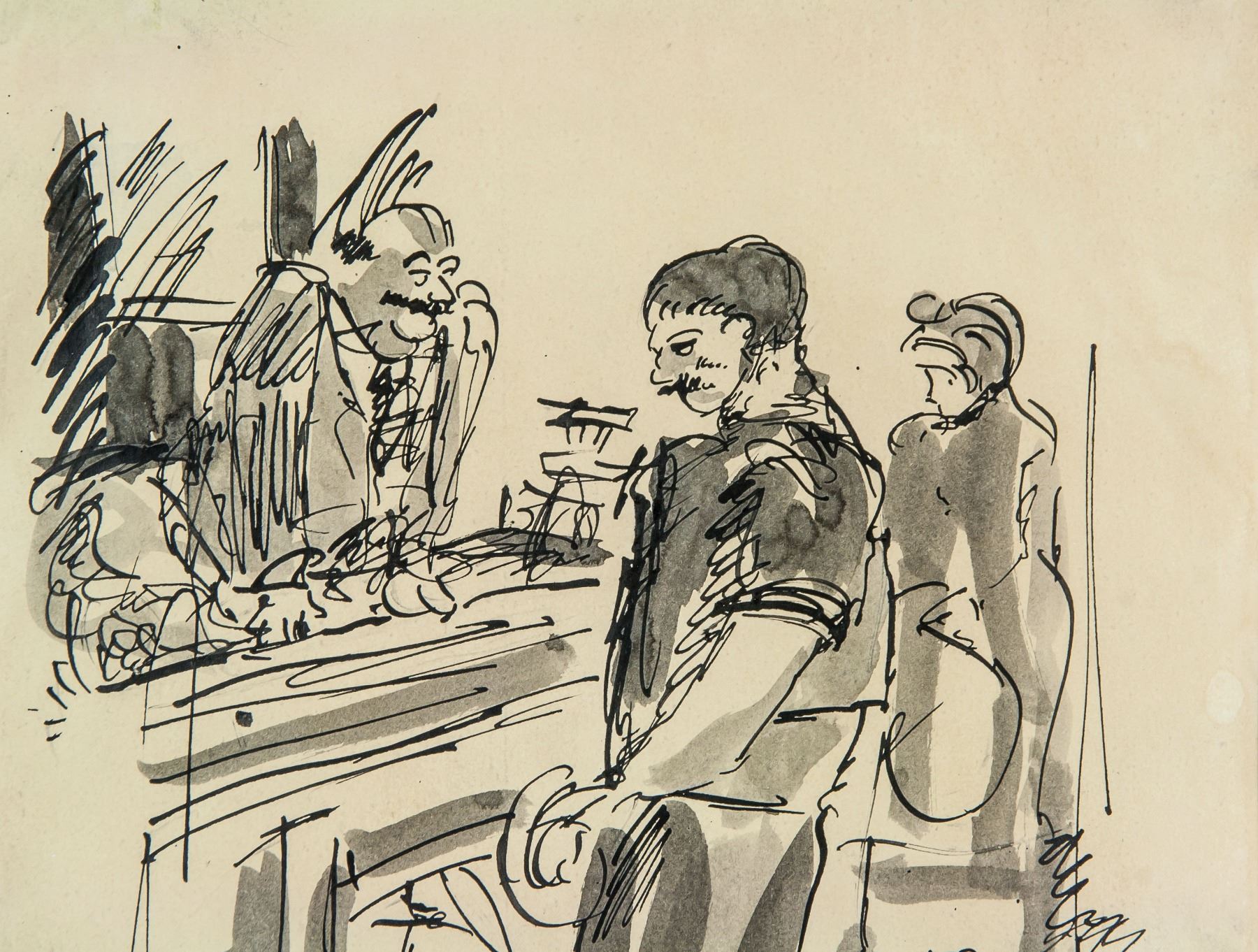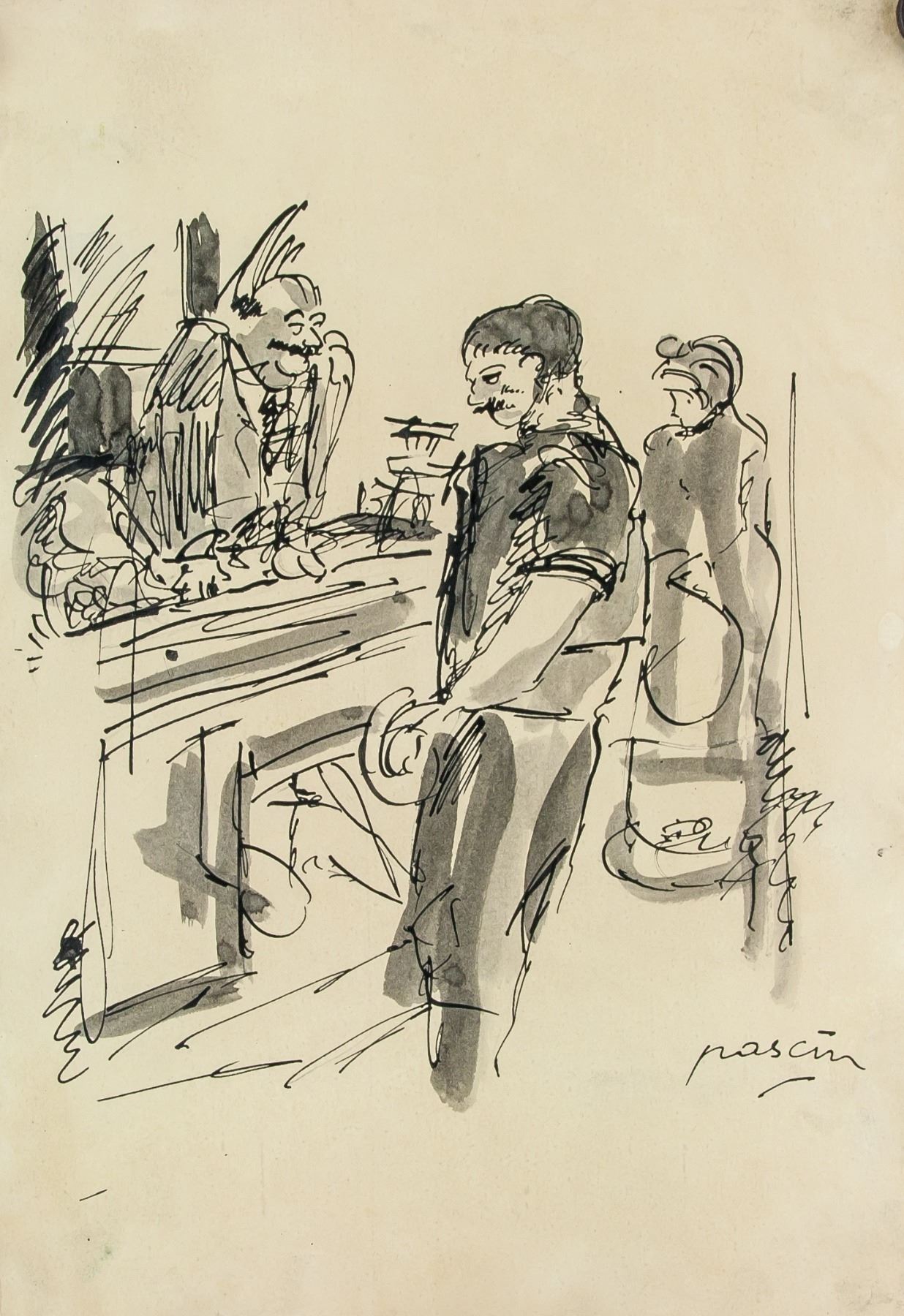 Ink on paper. Featuring a man at his table. Signed Pascin on the lower right edge. Attributed to Jules Pascin (1885-1930, Bulgarian-American). 11.5 x 8.25 in. (29.2 x 30 cm). PROVENANCE: This lot carries limited provenance from a Southern Ontario estate