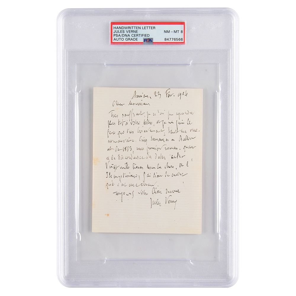 ALS in French, signed "Jules Verne," one page, 4 x 5.25, February 23, 1904. Handwritten letter to a gentleman, desirably naming three of his novels. In full: "Being very ill, I have not been able to answer your letter, and I can only do so briefly as my sight is very bad. Five Weeks in a Balloon [Cinq semaines en ballon] dates from 1863, my first novel…Regarding the discrepancy in dates between Twenty-Thousand Leagues Under the Seas [Vint mille lieues sous la mers] and The Mysterious Island [L& #39;Ile myst& eacute;rieuse], I have reason to believe that it is an error." In fine condition. Encapsulated and graded by PSA/DNA as "NM-MT 8."